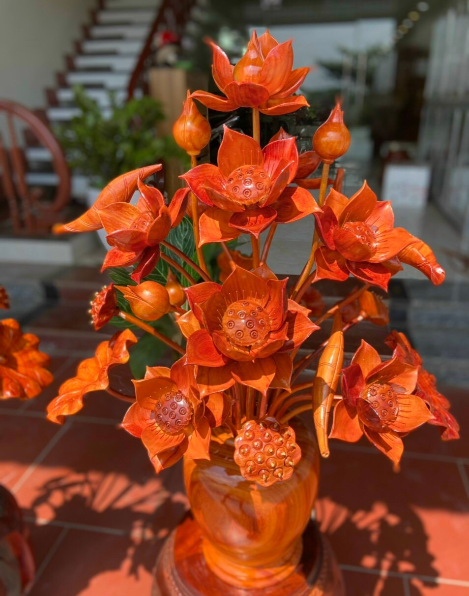 _ 1 bình hoa sen trang trí phòng khách phòng thờ được làm bằng chất liệu gỗ hương đỏ tự nhiên 100% _ Kt bình cắm cao 25×23cm +kt cao tổng hoa lá gương 82cm