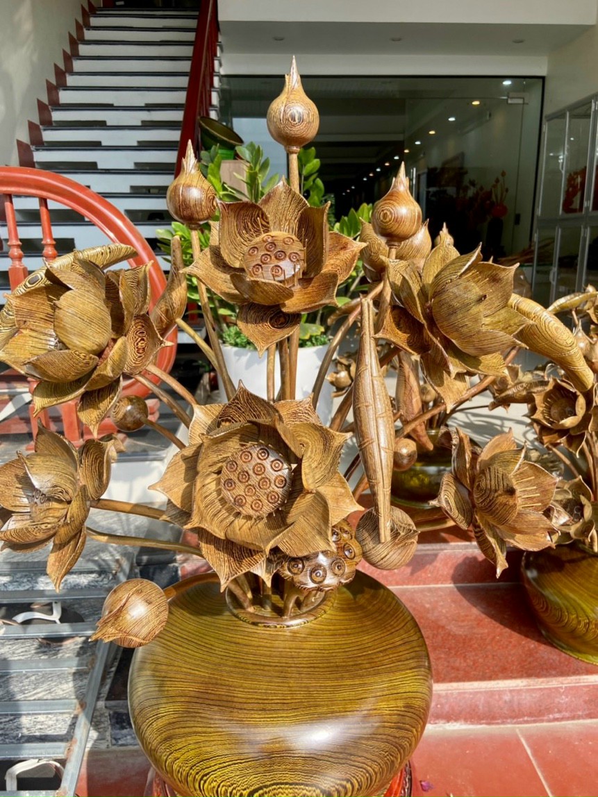 _ Bình hoa sen trang trí phòng thờ phòng khách ,phòng khách được làm bằng chất liệu gỗ mun đuôi công tự nhiên 100% _ kt bình cắm hoa 23×37cm + kt 25 hoa lá