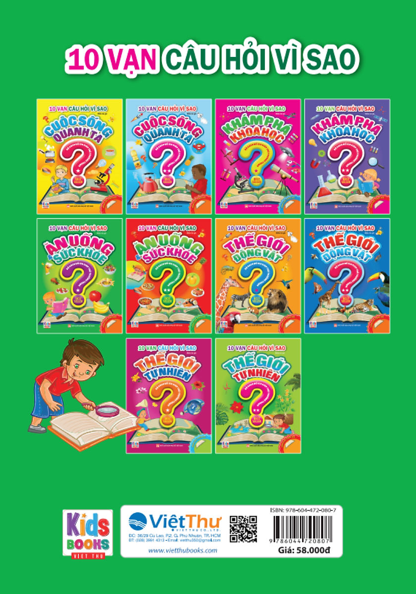 Trẻ em luôn tò mò và muốn tìm hiểu thêm về thế giới và những điều kỳ lạ xung quanh. Bé sẽ đặt rất nhiều những câu hỏi như "Vì sao?" với mong muốn được giải đáp. Bộ sách 10 vạn câu hỏi vì sao sẽ có câu trả lời cho các câu hỏi của bé xoay quanh chủ đề quen thuộc như Cuộc sống quanh ta, Ăn uống & Sức khỏe, Khám phá khoa học, Thế giới động vật, Thế giới tự nhiên. Bộ sách này sẽ là món quà tuyệt vời và ý nghĩa dành cho các bé.
