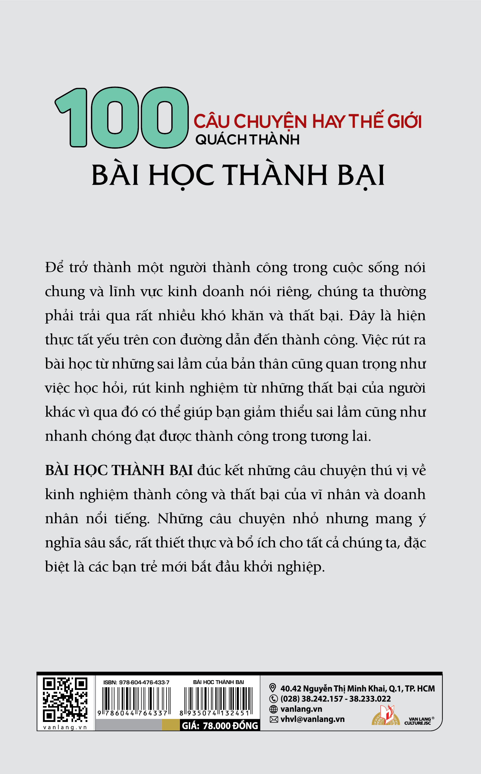 "Để trở thành một người thành công trong cuộc sống nói chung và lĩnh vực kinh doanh nói riêng, chúng ta thường phải trải qua rất nhiều khó khăn và thất bại. Đây là hiện thực tất yếu trên con đường dẫn đến thành công. Việc rút ra bài học từ những sai lầm của bản thân cũng quan trọng như việc học hỏi, rút kinh nghiệm từ những thất bại của người khác vì qua đó có thể giúp bạn giảm thiểu sai lầm cũng như nhanh chóng đạt được thành công trong tương lai. BÀI HỌC THÀNH BẠI đúc kết những câu chuyện thú vị về kinh nghiệm thành công và thất bại của vĩ nhân và doanh nhân nổi tiếng. Những câu chuyện nhỏ nhưng mang ý nghĩa sâu sắc, rất thiết thực và bổ ích cho tất cả chúng ta, đặc biệt là các bạn trẻ mới bắt đầu khởi nghiệp."