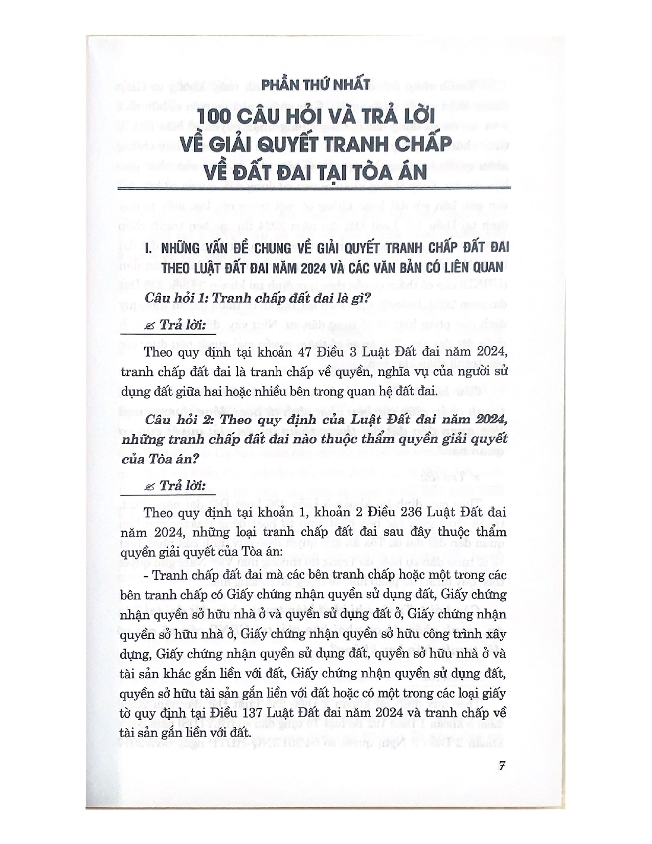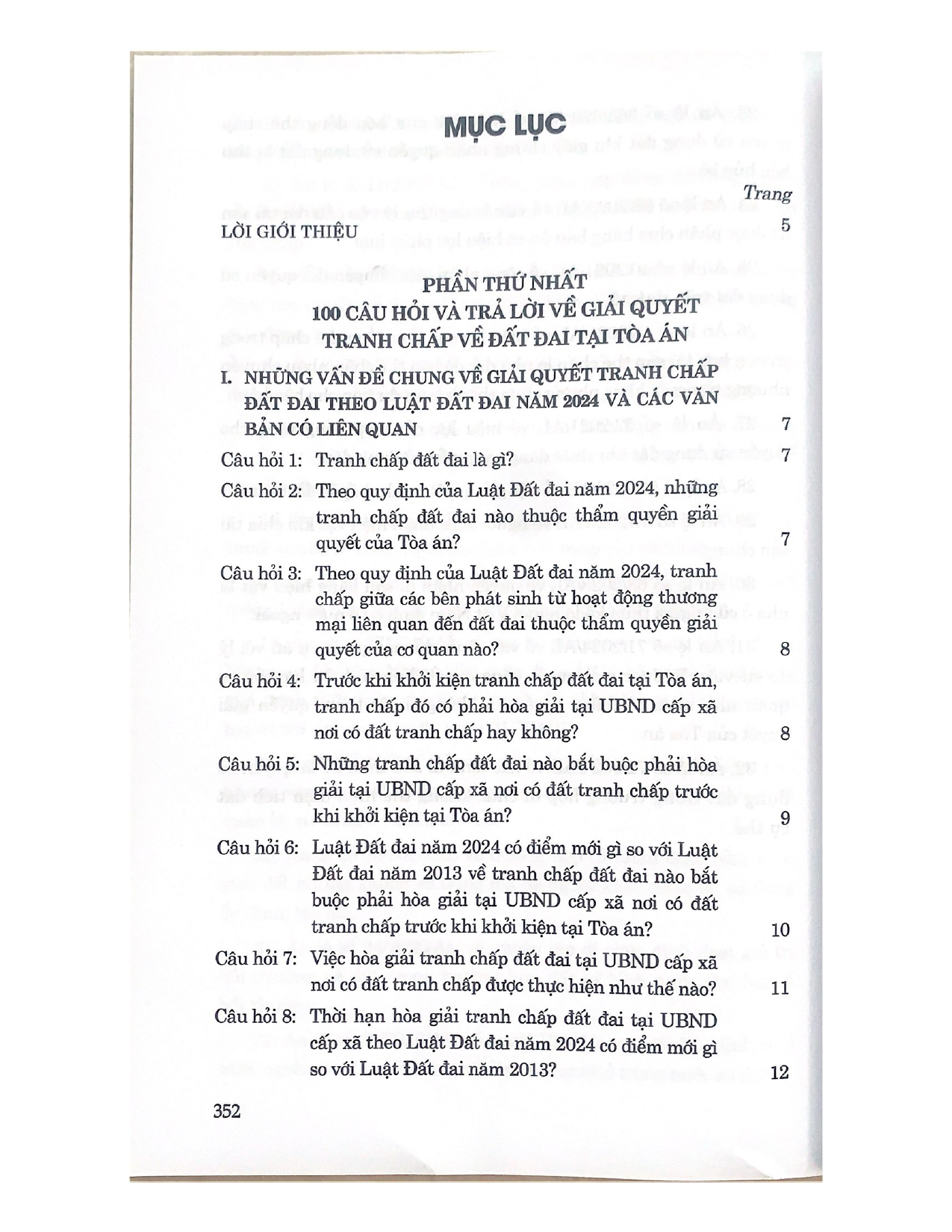 Sách- 100 câu hỏi giải quyết tranh chấp về đất đai tại Tòa án Tác giả: ThS.NCS. Tạ Đình Tuyên Nhà xuất bản: Nhà xuất bản Lao Động Ngày xuất bản: 8.2024 Công ty phát hành: Nhà sách Tư Pháp Sách khổ: 16x24 cm Số trang: 376 Giá bìa: 215.000 đ/1 cuốn  LỜI GIỚI THIỆU Ngày 18/01/2024, tại kỳ họp bất thường lần thứ năm, Quốc hội khoá XV đã thông qua Luật Đất đai năm 2024 (Luật số 31/2024/QH15) thay thế Luật Đất đai năm 2013. Luật Đất đai năm 2024 đã thể chế hóa đầy đủ, kịp thời các quan điểm, chủ trương của Đảng tại Nghị quyết Đại hội lần thứ XIII của Đảng, các nghị quyết, kết luận của Đảng về quản lý và sử dụng đất đai, đặc biệt là Nghị quyết số 18-NQ/TW ngày 16/6/2022 của Ban Chấp hành Trung ương Đảng khóa XIII về tiếp tục đổi mới, hoàn thiện thể chế, chính sách, nâng cao hiệu lực, hiệu quả quản lý và sử dụng đất, tạo động lực đưa nước ta trở thành nước phát triển có thu nhập cao. Việc ban hành Luật Đất đai năm 2024 nhằm hoàn thiện thể chế, chính sách về đất đai phù hợp với thể chế phát triển nền kinh tế thị trường định hướng xã hội chủ nghĩa; giải quyết tình trạng chồng chéo, mâu thuẫn trong các chính sách, pháp luật có liên quan đến đất đai. Luật Đất đai là luật quan trọng, tác động đến mọi mặt của đời sống kinh tế - xã hội, quốc phòng, an ninh, bảo vệ môi trường của đất nước; giữ vai trò trung tâm trong hệ thống pháp luật về đất đai, có mối quan hệ với nhiều quy định khác của hệ thống pháp luật. Chính vì vậy, việc tìm hiểu và áp dụng đúng các quy định của Luật Đất đai năm 2024 có ý nghĩa rất quan trọng. Trong bối cảnh đó, Nhà xuất bản Lao Động xuất bản cuốn “100 câu hỏi giải quyết tranh chấp về đất đai tại Tòa án” do ThS.NCS. Tạ Đình Tuyên biên soạn. Nội dung cuốn sách gồm 2 phần, phần thứ nhất bao gồm 100 câu hỏi và trả lời về giải quyết tranh chấp về đất đai tại Tòa án; phần thứ hai là quyết định của Hội đồng Thẩm phán  Tòa án nhân dân tối cao liên quan đến giải quyết tranh chấp về đất đai (năm 2023 - 2024).         5