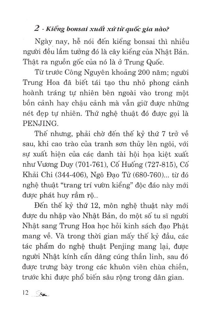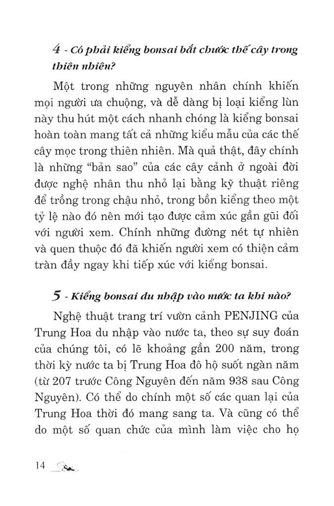 Mua tại Tiktok110 Câu Hỏi Đáp Chăm Sóc Và Tạo Dáng Bonsai Có nhiều quan niệm về Bonsai, trong khi người này xem Bonsai như là một trong những lẽ sống đầy ý nghĩa thiêng liêng cao cả của tư tưởng, triết học, tôn giáo, thì người khác lại xem đó chỉ là một thú vui lúc nhàn rỗi. Mỗi cây Bonsai là một tác phẩm nghệ thuật được lồng vào đó những kiến thức, ý tưởng và tình cảm của nghệ nhân tạo ra. Trong thời gian dài Bonsai là thú tiêu khiển của người quyền quý. Ngày nay được xem như là một nghệ thuật và cũng là một thú tiêu khiển của tất cả mọi người. Cuốn sách này sẽ cung cấp cho bạn đọc những bí quyết và phương cách chăm sóc, tạo dáng cho cây Bonsai của m.ình thêm đẹp mắt.
