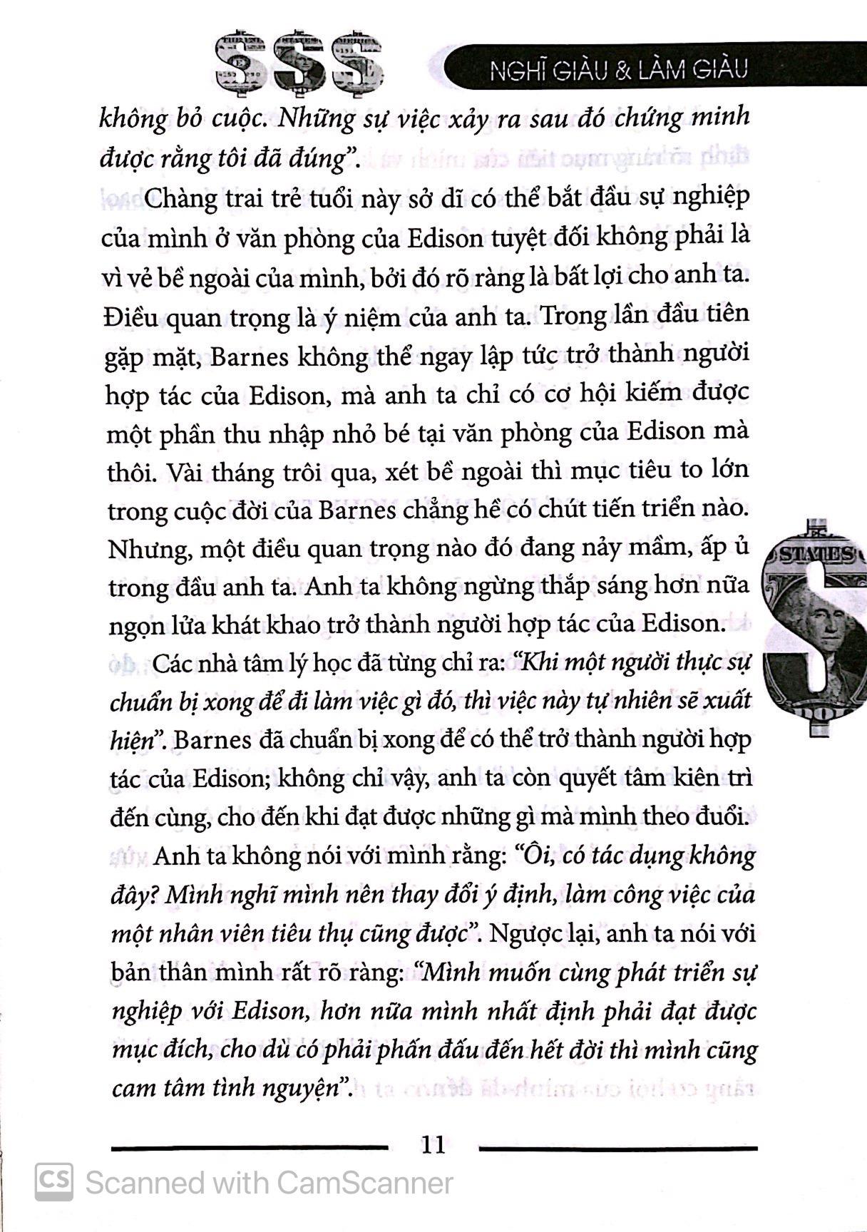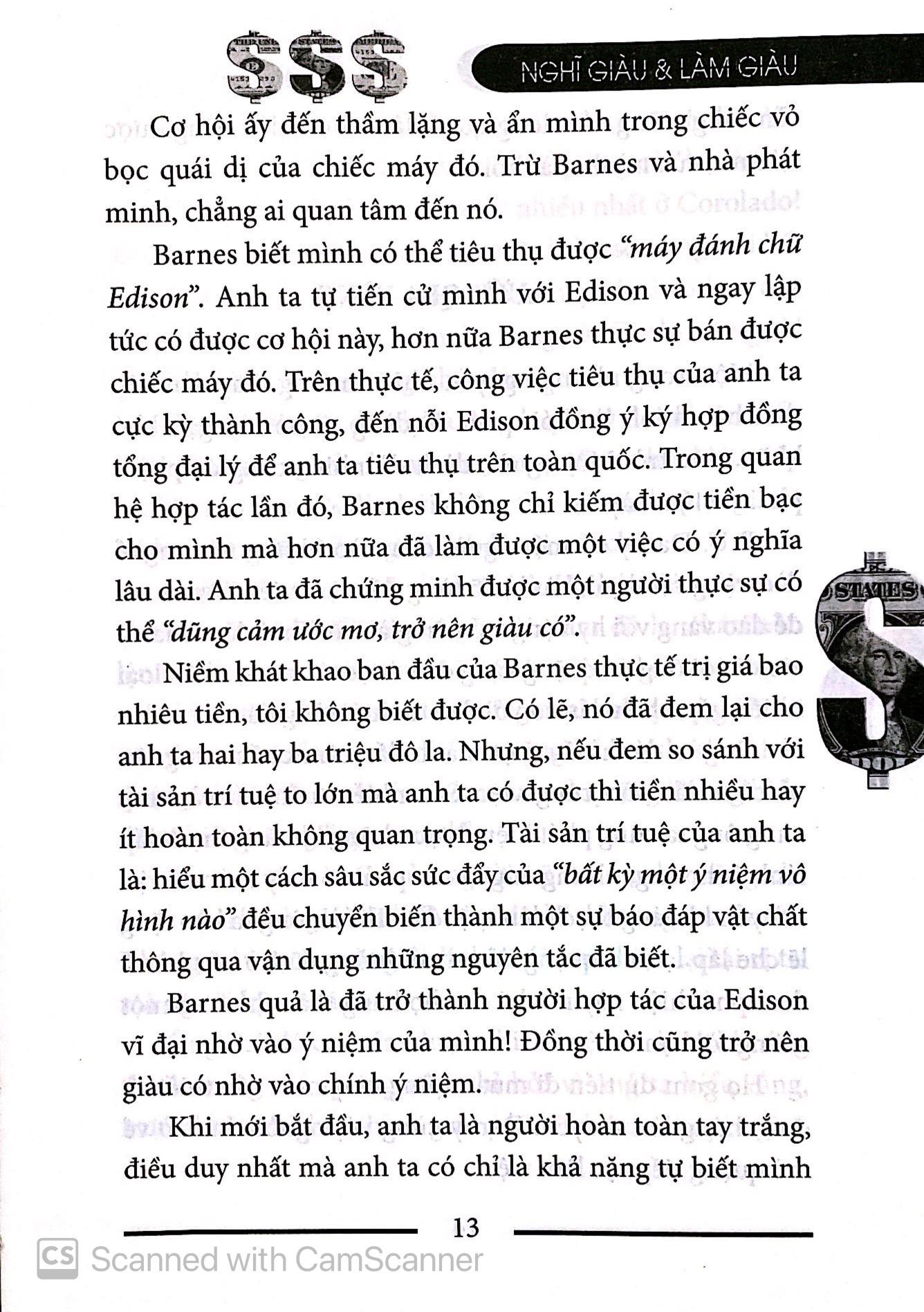 “Ý niệm tạo nên hiện thực”, điều này hoàn toàn đúng đắn, đặc biệt là khi ý tưởng kết hợp với một mục đích đã định, nghị lực cũng như sự mong muốn biến ý tưởng thành của cải hoặc các mục tiêu khác, thì ý tưởng sẽ càng là một sự thực có đầy đủ sức mạnh. CÁI GỌI LÀ CONTROLUTT. Tú Nhiều năm trước đây, EdwinC. Barnes đã phát hiện rằng “tư duy để làm giàu” là một sự thật không gì bác bỏ được. Phát hiện của ông nhờ vào sự tích lũy dần dần, bắt nguồn từ niềm khát khao cháy bỏng muốn trở thành người hợp tác với Edison. PC Kháng VTCN Thành 3 con BỘ Một trong những đặc trưng chủ yếu của niềm khát khao của Bames chính là sự rõ ràng và kiên định. Ông muốn cùng hợp tác làm ăn với Edison chứ không đơn thuần chỉ là “làm việc cho Edison”. Quan sát kỹ quá trình biến ý tưởng thành hiện thực của ông, bạn sẽ càng thấu hiểu hơn các nguyên tắc làm giàu. Khi nỗi khát khao hay ý niệm này lần đầu tiên vụt qua trong đầu, ông hoàn toàn không có tiền để thực hiện nó. Ông đứng trước hai khó khăn: thứ nhất là, ông không hề quen biết Edison; thứ hai là, ngay cả tiền mua một chiếc vé tàu đến bang New Jersy ông cũng chẳng có. Hai khó khăn này hoàn toàn có thể khiến đại đa số người khác nguội lạnh, nản lòng, dẫn đến từ bỏ việc thực hiện ý tưởng đó. Nhưng, sự khao khát của Bames lại cháy bỏng hơn người.