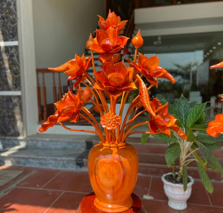 _ 1 bình hoa sen trang trí phòng khách phòng thờ được làm bằng chất liệu gỗ hương đỏ tự nhiên 100% _ Kt bình cắm cao 25×23cm +kt cao tổng hoa lá gương 82cm