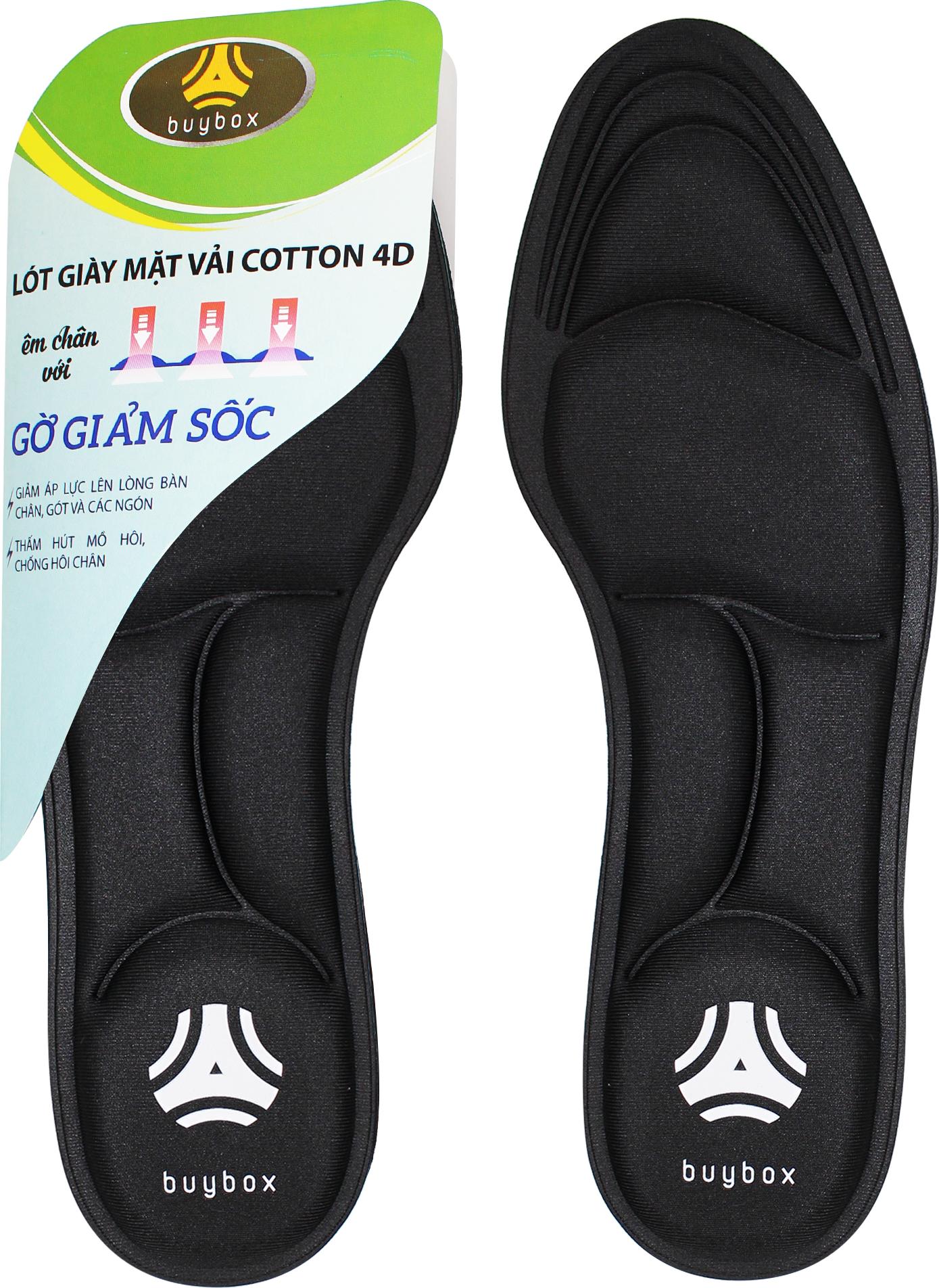- Từ nay không còn phải lo lắng nữa vì đã có lót giày đa năng 4D buybox giúp êm chân và chống hôi chân CÔNG DỤNG NỔI BẬT Loại lót giày nguyên bàn chân, thiết kế 4D cực êm Sản phẩm có thể giặt sạch bằng xà phòng nhẹ và tái sử dụng nhiều lần, dễ tháo lấp Giày đi lâu ngày, phần lót giày bị lún, lót vào đi êm chân hơn, thoải mái. Sản phẩm thiết kế 4D, kết hợp 2 trong 1 vừa bảo vệ chân, chống được mồ hôi chân. Được làm từ chất liệu cao cấp rất êm chân, thoáng khí & bền bỉ. Mặt dưới miếng lót in các đường cong tương ứng các size 35 - 36 - 37 - 38 - 39 - 40. Dùng kéo cắt theo các đường cong này để có được kích thước cần sử dụng. Lót giày đa năng 4D sử dụng được cho nhiều loại giày khác nhau như: giày cao gót mũi nhọn, giày búp bê mũi nhọn, giày mọi, giày lười, giày thể NGỮ CẢNH SỬ DỤNG
