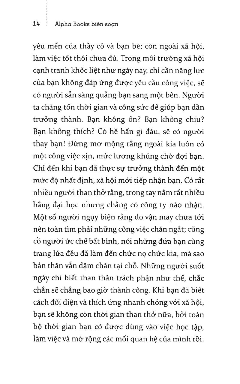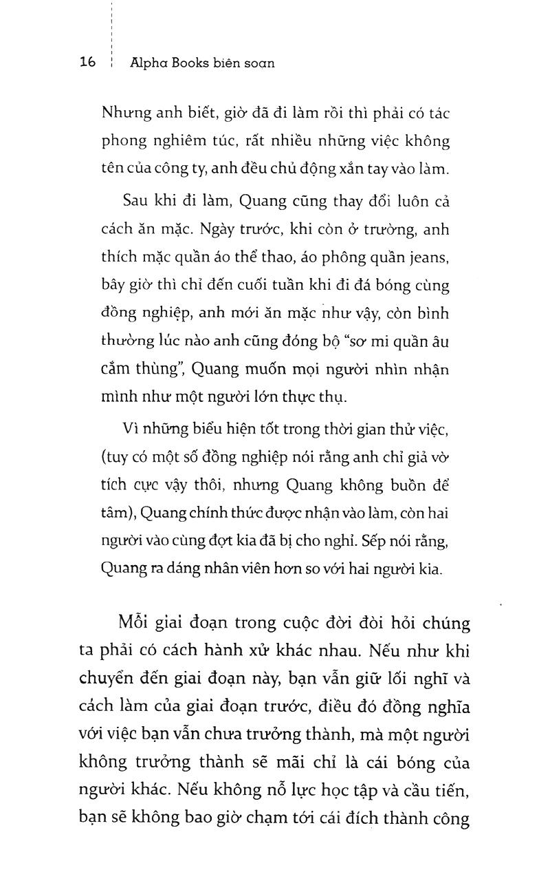 Quan trọng hơn hết, cuốn sách hướng đến rèn luyện cho các bạn trẻ vừa rời khỏi giảng đường đại học một phong thái đĩnh đạc, đúng mực, thái độ cầu tiến, khiêm tốn và khả năng cân bằng cảm xúc trong mọi hoàn cảnh. Có như vậy, sự nhiệt tình và năng động của bạn mới phát huy hiệu quả trong công việc và cuộc sống.