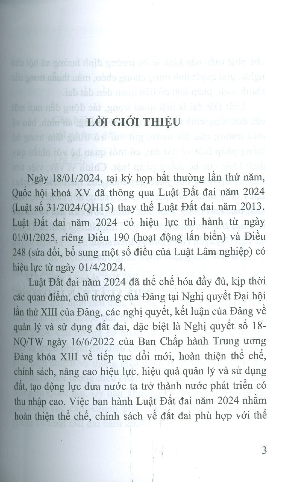 Ngày 18/01/2024, Quốc hội nước Cộng hòa xã hội chủ nghĩa Việt Nam thông qua Luật Đất đai số 31/2024/QH15, đã thể chế hóa đầy đủ, kịp thời các quan điểm, chủ trương của Đảng