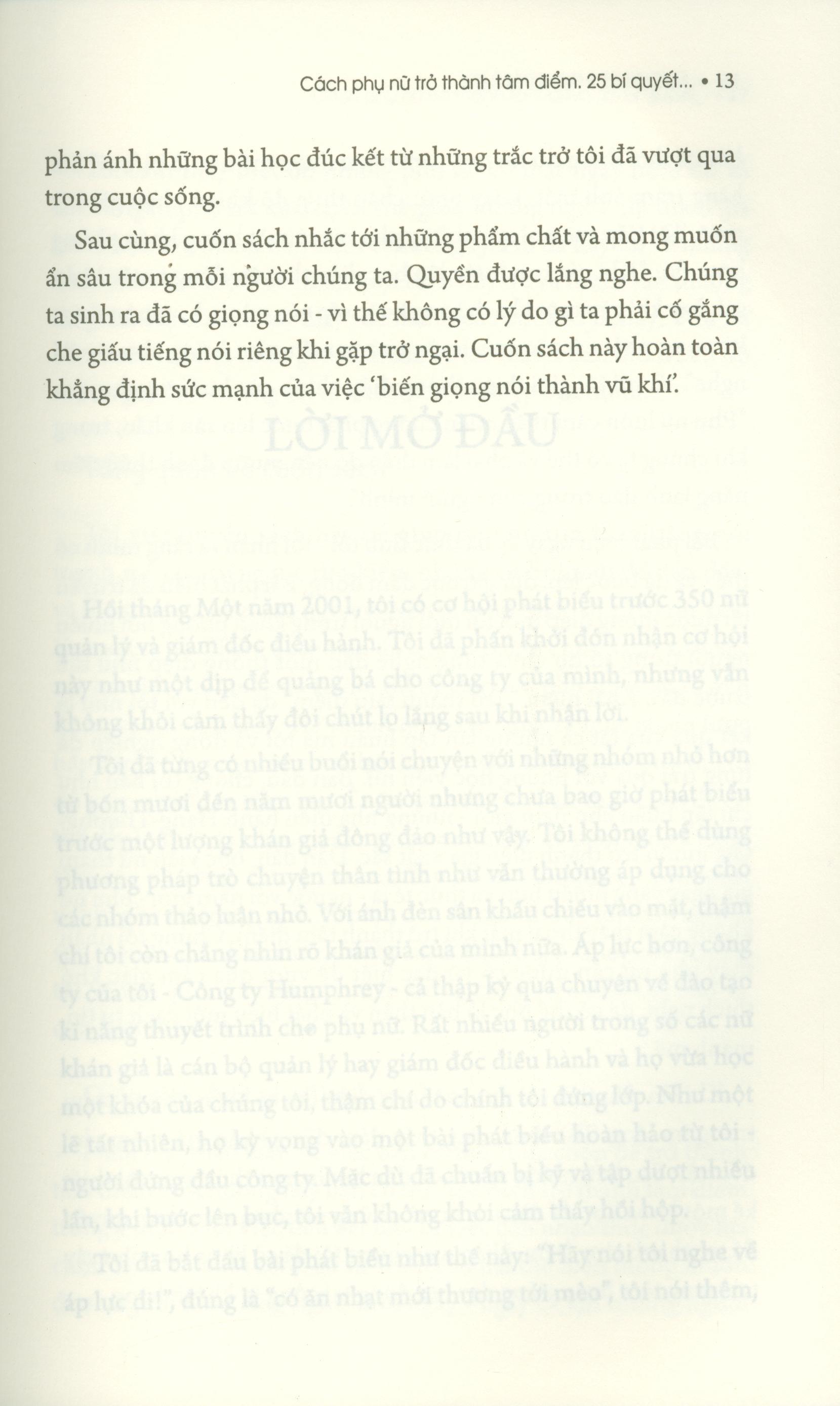 “25 BÍ QUYẾT ĐỂ TRỞ THÀNH NỮ LÃNH ĐẠO TÀI BA tập trung vào một trong những kĩ năng quan trọng mà phụ nữ cần có: khả năng phát ngôn một cách vững chắc, rõ ràng và thuyết phục. Tôi đã nhận ra từ sự nghiệp của tôi rằng khả năng để nói một cách tự tin, rõ ràng, và có phong cách là yếu tố để xác định ai sẽ là ứng cử viên hàng đầu - điều này đúng cho cả phụ nữ và nam giới, Judith Humphrey đã đưa ra một khuôn mẫu để đạt được điều đó.” - Sue Spradley, Phó chủ tịch và Giám đốc, Công ty khởi động mạng lưới và dịch vụ, JDSU.