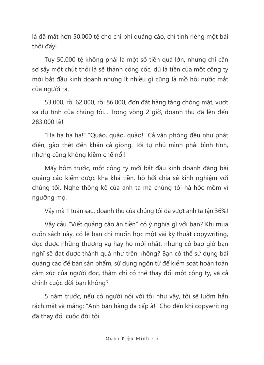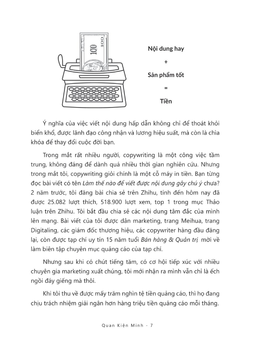 - Kết thúc vấn đề sắc nét Copywriting không chỉ đơn giản viết đúng ngữ pháp, mà là câu chuyện của sự sáng tạo và thuyết phục qua con chữ. Bạn không cần phải là một người xuất chúng để viết, bạn chỉ cần chịu khó học hỏi và rèn luyện mà thôi! Về tác giả: Quan Kiện Minh là cựu nhà quảng cáo của Ogilvy, từng làm việc cho Mercedes-Benz, sau đó chuyển sang một công ty y tế, các bài quảng cáo ông viết giúp hiệu suất tăng 11 lần trong 4 năm. Sau đó, anh được mời viết một bài quảng cáo trên WeChat cho Zebra Craft Beer, giúp tăng tỷ lệ chuyển đổi đơn hàng trung bình lên 76,86% và một trong những dòng tweet đã trực tiếp bán được 358.000 sản phẩm. Anh là người phụ trách chuyên mục của tạp chí lâu đời Bán hàng và Quản lý, và 36 bài báo tiếp thị dài đã được các phương tiện tiếp thị hàng đầu như Advertising Gate, M và S tái bản liên tục.