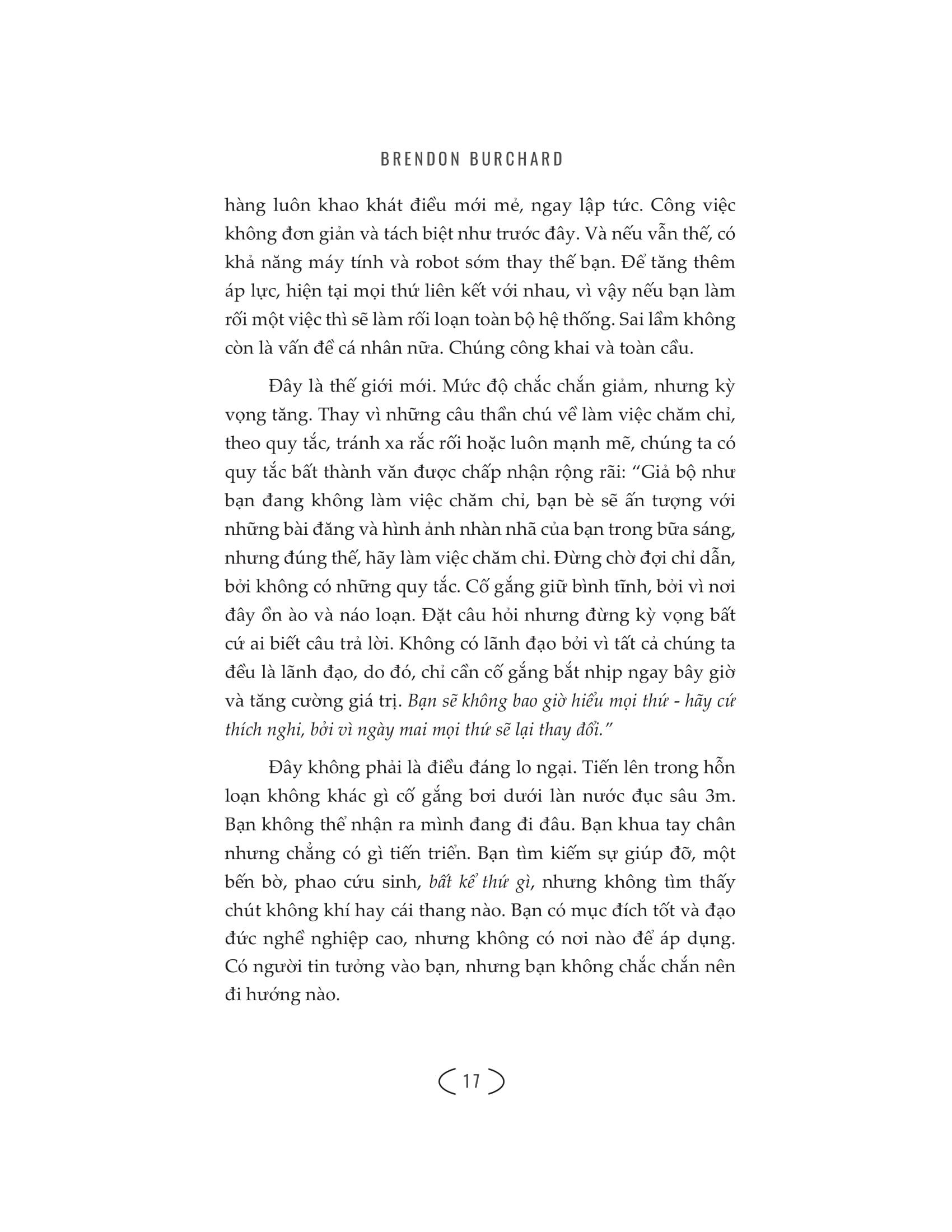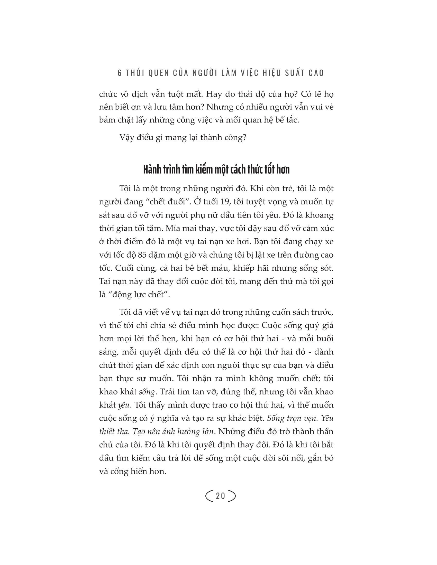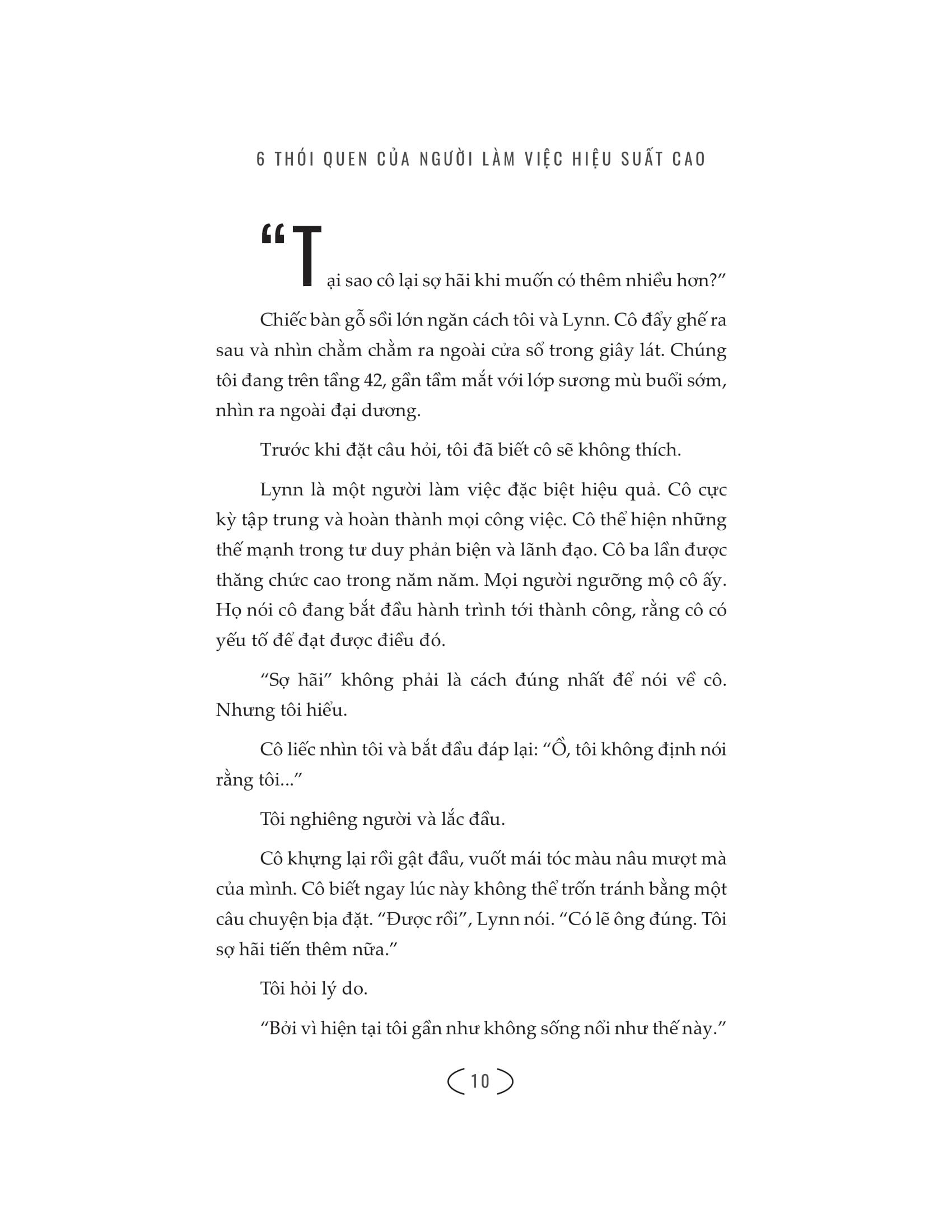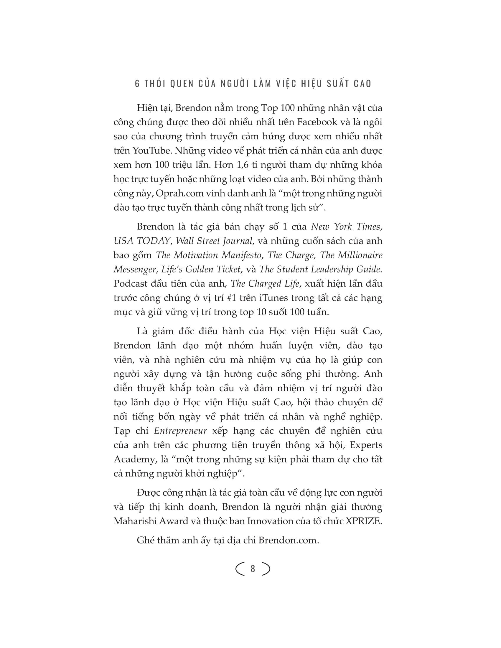 - Thể hiện lòng can đảm Cuốn sách “High performance habits – 6 thói quen của người làm việc hiệu suất cao” diễn giải chi tiết cách thức để thực hành những thói quen này. Cuốn sách đã tổng hợp những nghiên cứu trong 20 năm của tác giả Brendon Burchard từ hoạt động huấn luyện của mình. Đây là các tổng kết đắt giá nhất có được nhờ các cuộc khảo sát, phỏng vấn tiêu chuẩn và các công cụ đánh giá chuyên nghiệp về những người có hiệu suất cao trên toàn thế giới. Tác phẩm hé lộ một người nên nắm bắt điều gì để trở thành một người hiệu suất cao – có thể tạo ra những cấp độ ngày càng tăng của hạnh phúc, sức khỏe và thành công lâu dài. Nếu bạn muốn hình thành một thói quen nào mới để thành công nhanh hơn, hãy chọn những thói quen trong cuốn sách này. Bất cứ ai cũng có thể thực hành chúng, và bạn sẽ thấy những điều phi thường xảy ra trong cuộc sống, các mối quan hệ và sự nghiệp. Nếu bạn muốn đạt được nhiều thứ hơn, lãnh đạo tốt hơn, phát triển kĩ năng nhanh hơn, hoặc đạt được nhiều niềm vui và tự tin hơn, “High performance habits – 6 thói quen của người làm việc hiệu suất cao” sẽ trợ giúp đắc lực cho bạn.