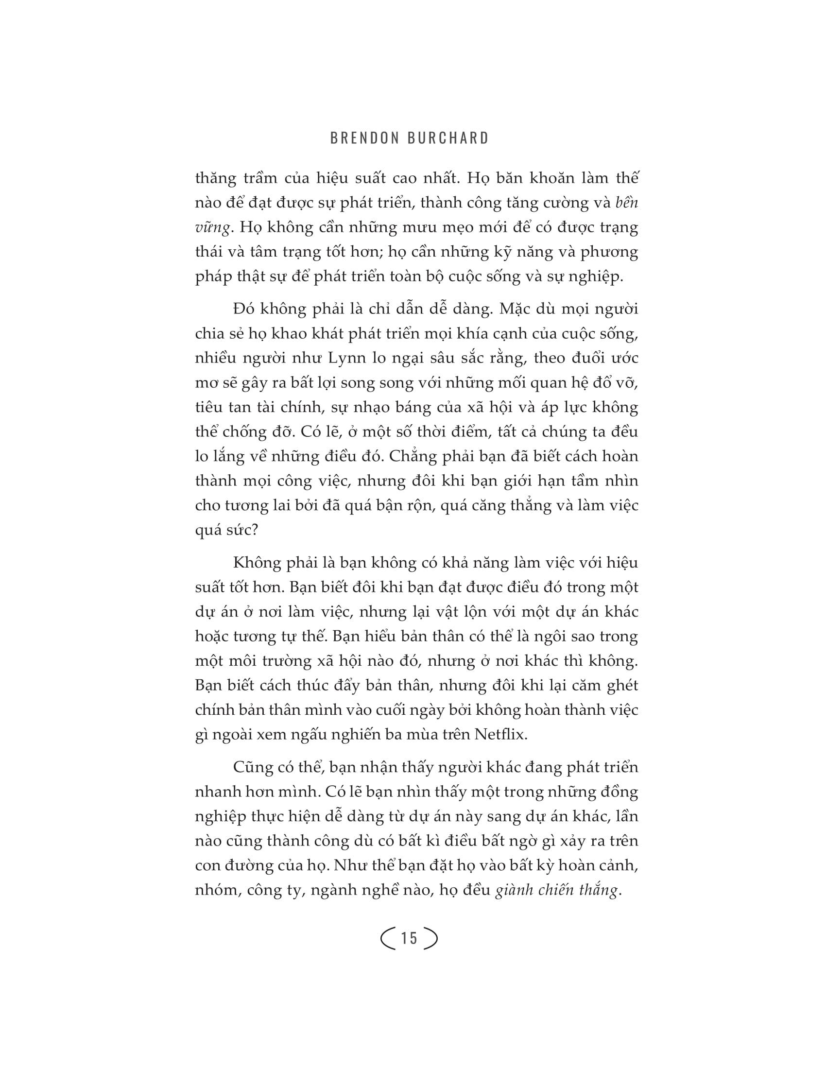 Tất cả chúng ta đều muốn có hiệu suất cao trong mọi lĩnh vực cuộc sống, từ học tập, làm việc, đến mở rộng mối quan hệ hay xử lý các vấn đề cá nhân. Nhưng ta phải làm những gì, phải hình thành những thói quen nào để đạt được thành công lâu dài và hạnh phúc bất kể tuổi tác, nghề nghiệp, ưu điểm hay tính cách của ta? Brendon Burchard – một trong những nhà huấn luyện uy tín nhất thế giới hiện nay về vấn đề phát triển bản thân đã chỉ ra 6 thói quen cần có để tối ưu hiệu suất làm việc. Đó là: