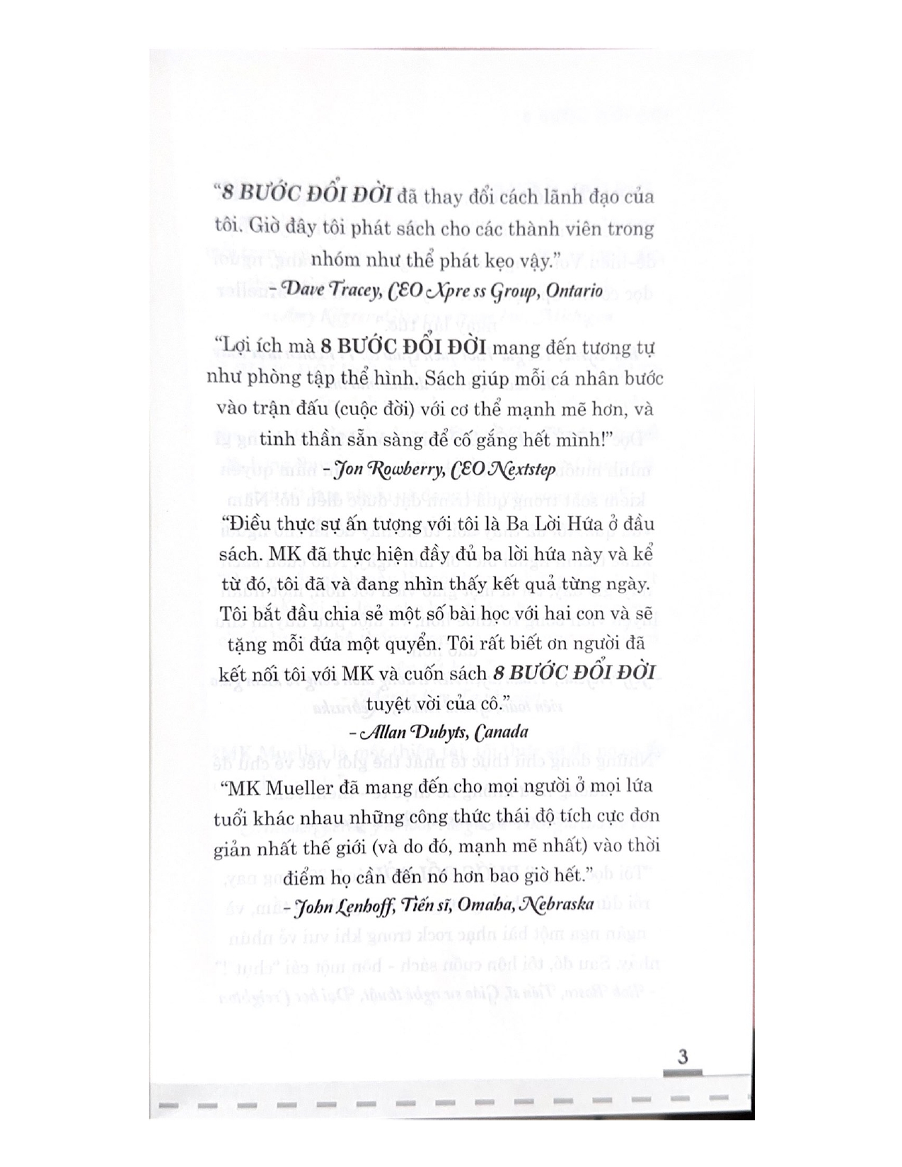 - Giới thiệu 8 Bước Đổi Đời - 8 To Great Trong 8 BƯỚC ĐỔI ĐỜI, tác giả MK Mueller trình bày 8 bước cơ bản mà những người hạnh phúc, khỏe mạnh và thành công nhất đều áp dụng. Sách dựa trên quá trình 8 bước giúp mọi người theo đuổi ước mơ - dù cho đó là giảm cân và giảm đường mà không lên cơn thèm, tìm được công việc mơ ước, tận hưởng mối quan hệ như mơ, nâng cao thành tích thể dục thể thao trong vài ngày, thoát nợ, hoặc giành được học bổng vào đại học. Cách tiếp cận 8 bước giúp kết nối thân-tâm-trí của tác giả được hình thành dựa trên những nguyên tắc sống mãi với thời gian như chịu trách nhiệm hoàn toàn, dám mạo hiểm, cảm nhận mọi cảm xúc và tha thứ cho quá khứ. Đây là cuốn sách chạm đến trái tim của người đọc và giúp thay đổi mỗi người từ trong ra ngoài.
