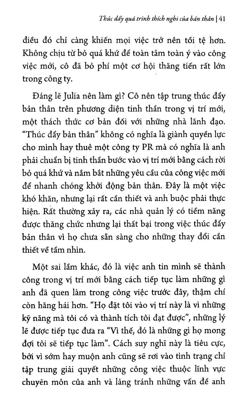 -Thúc đẩy bản thân thích nghi với chức vụ và môi trường: Các nhà lãnh đạo cần dẹp bỏ lối suy nghĩ và cách làm việc trong vị trí cũ để đảm nhiệm vai trò mới. Đừng cho rằng những gì từng giúp m.ình thành công trước đây sẽ tiếp tục phát huy hiệu quả.