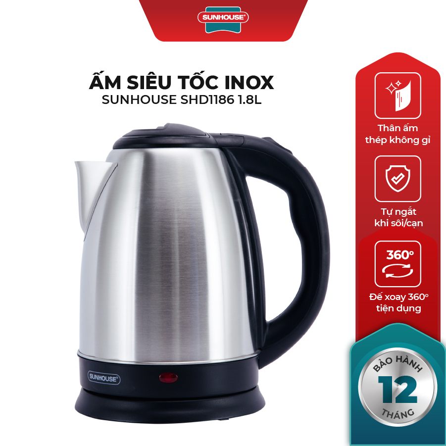 Ấm Siêu Tốc Inox Sunhouse SHD1186 - 1.8L (Bạc) có thân bình được làm bằng inox không gỉ đảm bảo vệ sinh cho nguồn nước. Đồng thời chất liệu sáng bóng, dễ dàng chùi rửa và mang lại độ bền bỉ cho quá trình sử dụng.