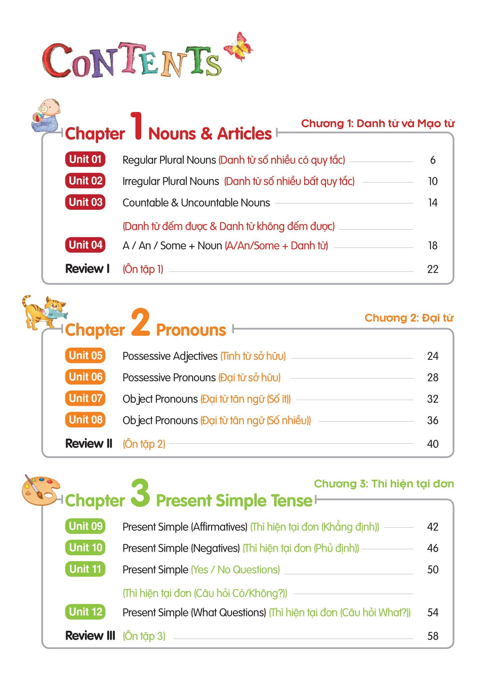 - Sách gồm 6 chương với 24 Unit, tổng hợp tất cả những chủ đề ngữ pháp hay nhất trong chương trình lớp 4 như: Danh từ & Mạo từ, Đại từ, động từ to-be, … Những kiến thức ngữ pháp nên tảng vững chắc đầu tiên này sẽ giúp con phát huy tối đa khả năng tiếng Anh khi lên những lớp cao hơn.