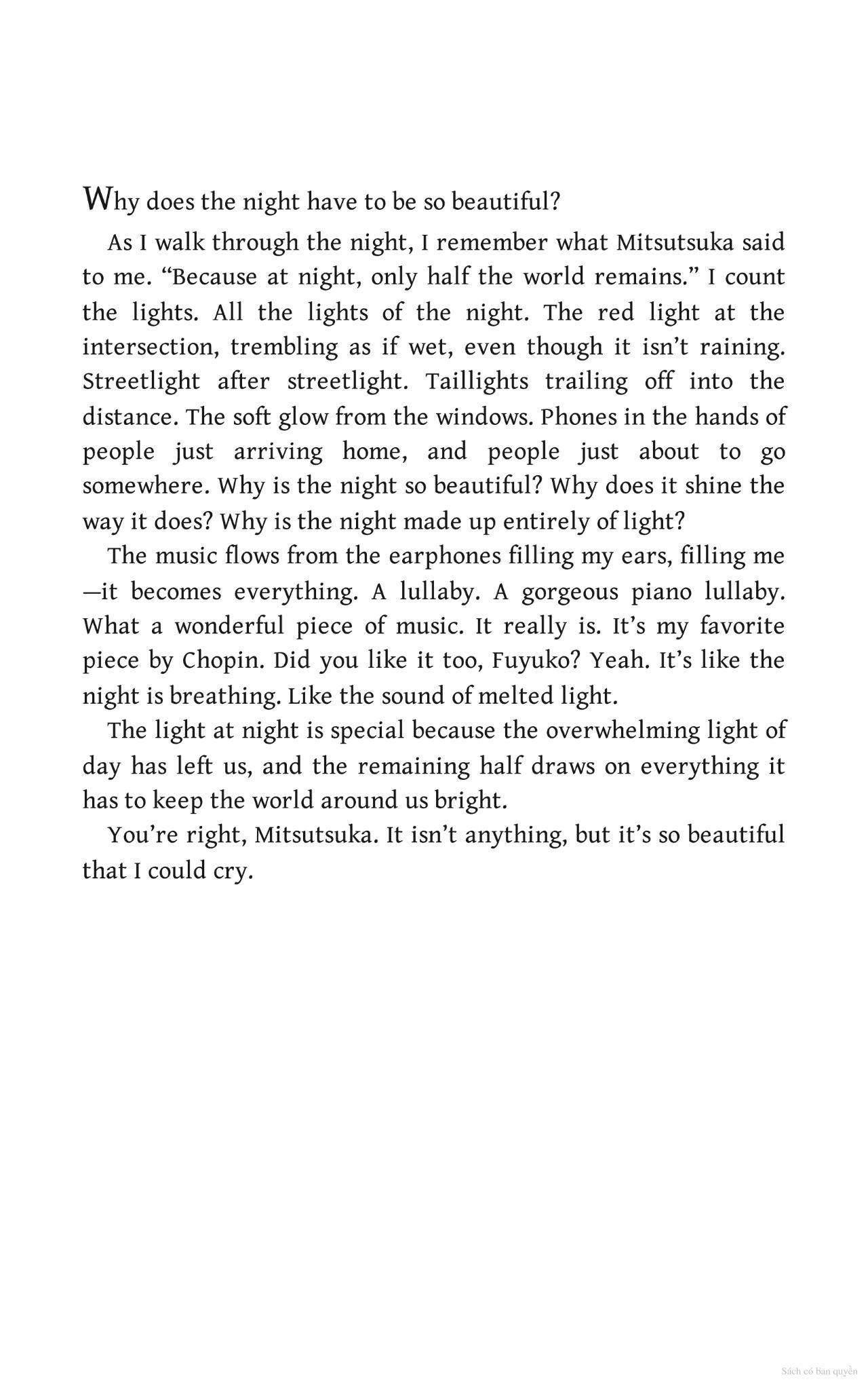 Fuyuko Irie is a freelance proofreader in her thirties. Living alone in an overwhelming city and unable to form meaningful relationships, she has little contact with anyone other than her colleague, Hijiri. But a chance encounter with a man named Mitsutsuka awakens something new in her. Through their weekly meetings, Fuyuko starts to see the world in a different light and still, painful memories from her past begin to resurface.