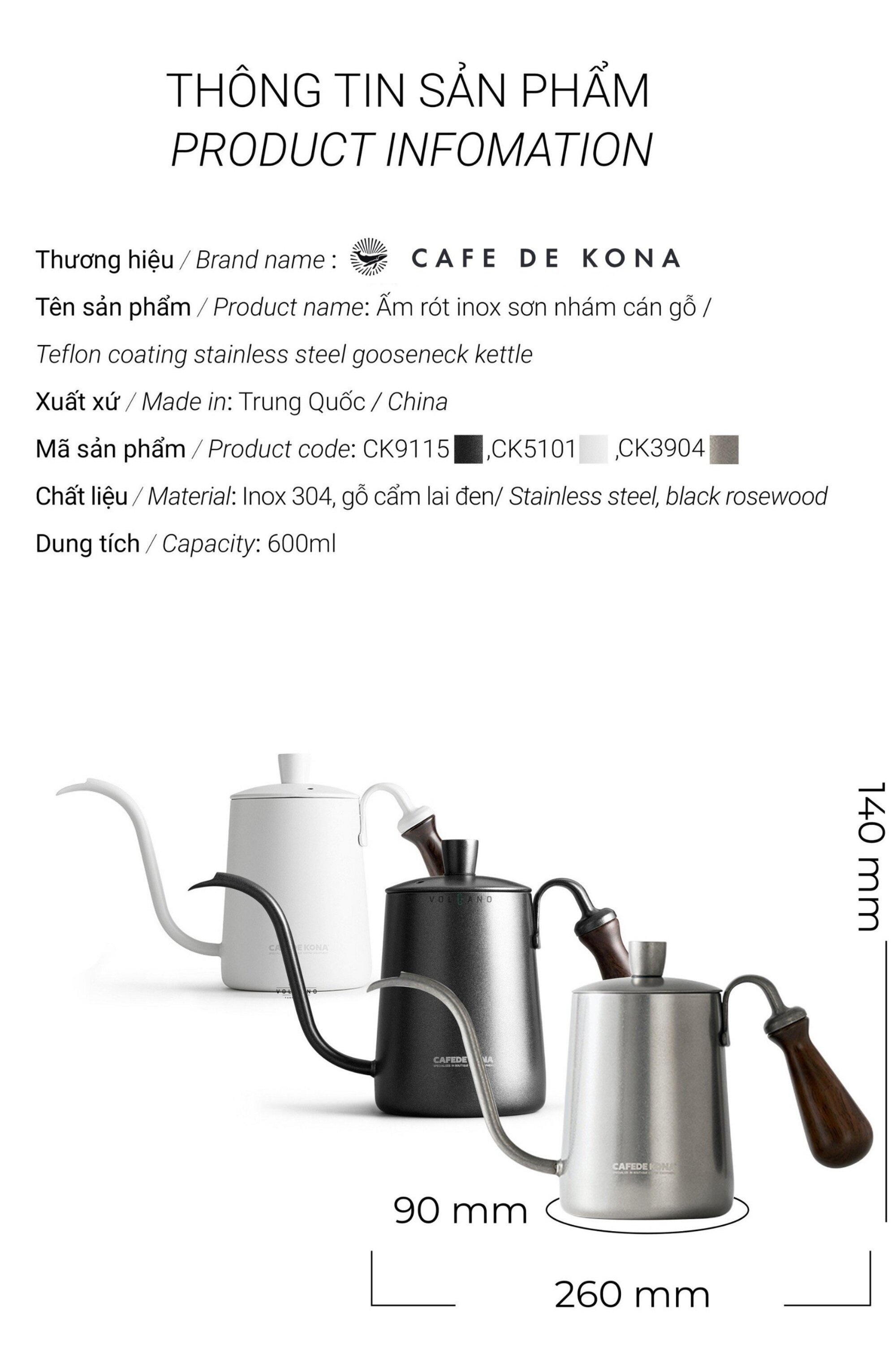 ẤM BÌNH RÓT NƯỚC NÓNG PHA CÀ PHÊ BẰNG INOX, CÁN GỖ CAFE DE KONA