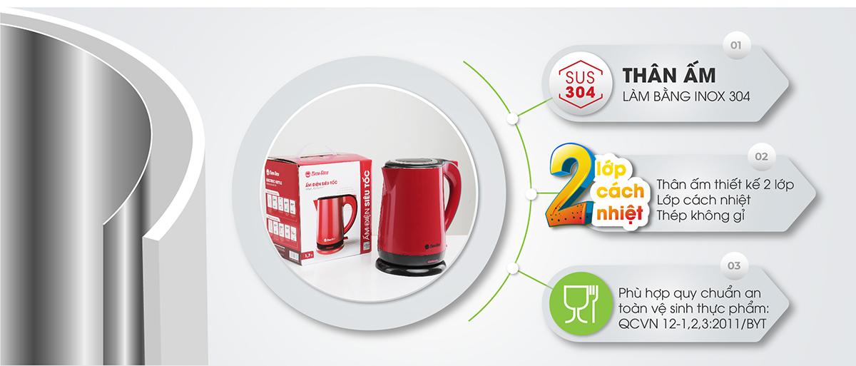Dung tích: 1.7L Công suất: 1800W Ưu điểm nổi bật: 2 lớp cách nhiệt: Thép không gỉ bên trong, nhựa mát tay bên ngoài – an toàn tuyệt đối, nhất là với gia đình có