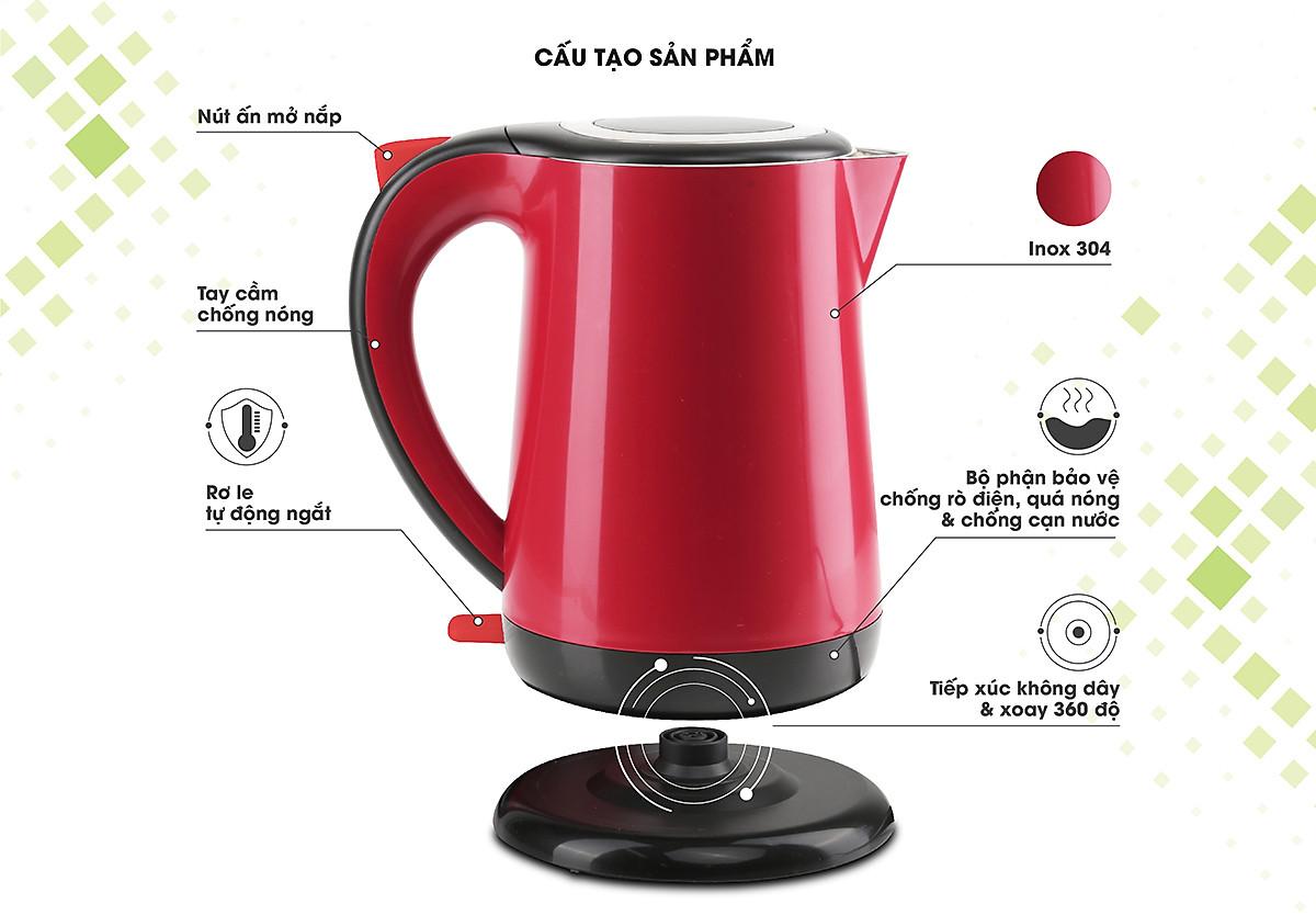 Đặc điểm nổi bật Công suất 2000 W cùng dung tích 2 L Hiệu quả đun sôi mạnh mẽ, đủ nước cho cả gia đình Vỏ bình bằng nhựa, ruột bằng chất liệu Inox cao
