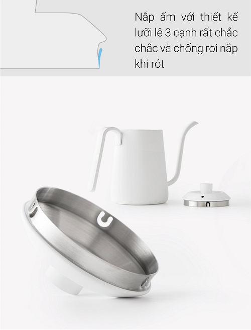 Ấm rót được làm từ chất liệu thép không gỉ có khả năng chống mài mòn cao. Chiếc vòi cổ ngỗng mềm mại cho dòng chảy ổn định. Miệng vòi với thiết kế độc nhất giúp dòng nước chảy góc vuông 90 độ khi Pour. Mặt đáy phẳng phù hợp với mọi loại bếp phổ biến.
