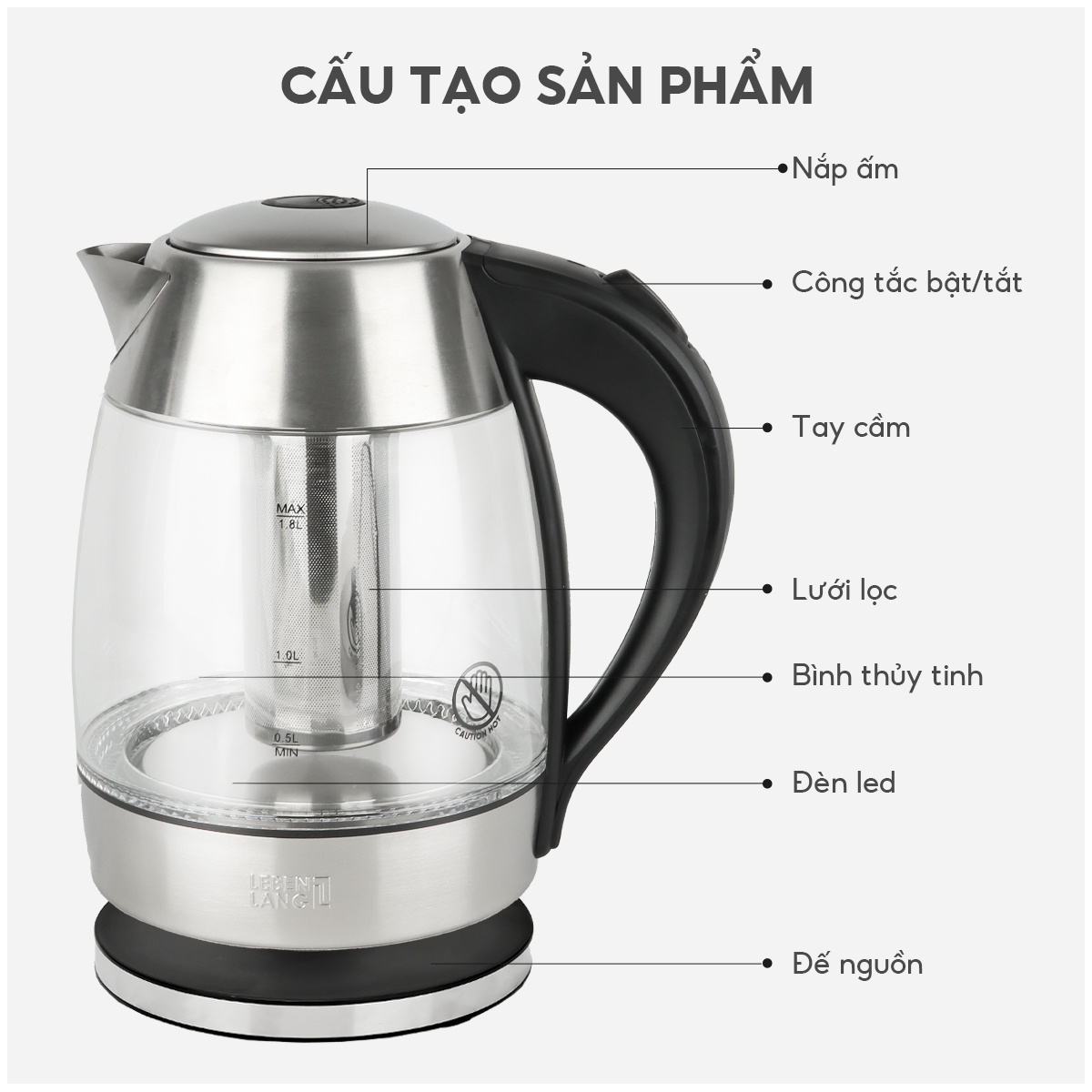 - Thiết Kế Độc Đáo: Ấm siêu tốc Lebenlang LBLB2226 với thân bình bằng thủy tinh cao cấp, cùng với lưỡi lọc trà inox 304 có thể tháo rời, không chỉ tinh tế mà còn rất tiện lợi cho việc pha trà.
