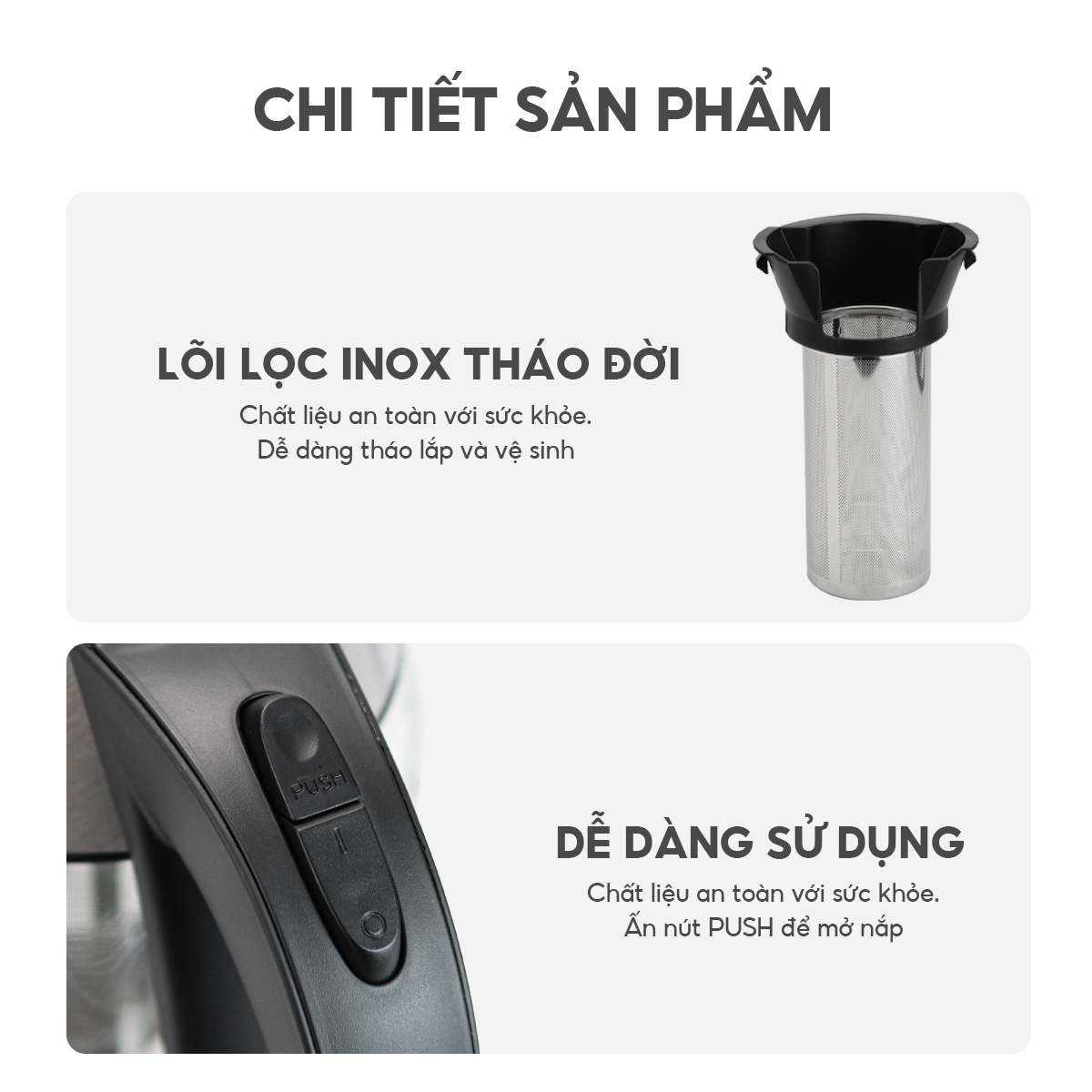 Đặc điểm nổi bật: Thiết kế nhỏ gọn, màu Xám thời thượng và bình trong suốt dễ quan sát Công suất mạnh mẽ lên đến 1850-2200W giúp nước sôi nhanh hơn Bộ role Maxtric tự