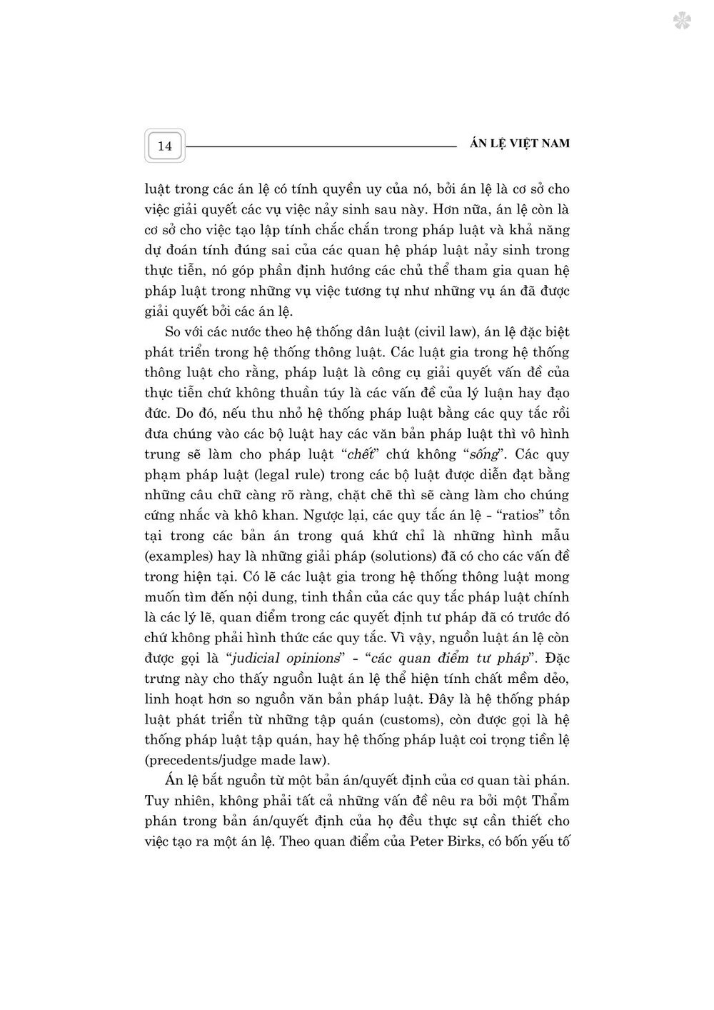Trên cơ sở khái quát quá trình phát triển án lệ ở Việt Nam và kinh nghiệm xây dựng, áp dụng án lệ ở một số quốc gia trên thế giới, cuốn sách chuyên khảo Án lệ Việt Nam phân tích thực trạng áp dụng án lệ trong thực tiễn xét xử và khuyến nghị một số giải pháp nhằm nâng cao chất lượng quá trình nghiên cứu, đề xuất, công bố và áp dụng án lệ. Ngoài 3 chương chính, phần phụ lục của cuốn sách giới thiệu toàn văn 72 án lệ đã được công bố và phát triển từ các bản án, quyết định của Tòa án nhân dân các cấp.