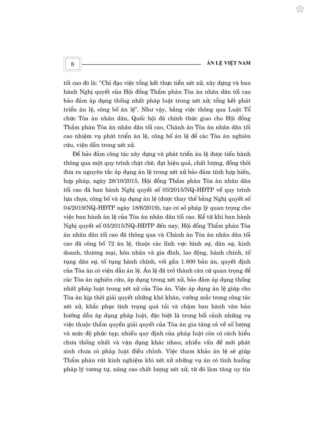 Cuốn sách là tài liệu quý trong việc tìm hiểu, nghiên cứu và viện dẫn án lệ cho các Thẩm phán, Hội thẩm và các chức danh tư pháp của Tòa án, cũng như bạn đọc quan tâm đến vấn đề này.