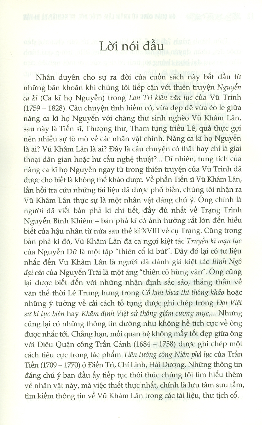 Vũ Khâm Lân (1703 – 1758), hiệu Di Trai (hoặc Di Hiên), Vu Tẩu, quê ở xã Ngọc Lặc, tổng Mỹ Xá, huyện Tứ Kỳ, trấn Hải Dương (nay là thôn Ngọc lặc, xã Ngọc Sơn, thành phố Hải Dương, tỉnh Hải Dương). Ông là một nhà nho – học giả - quan chức có vị trí đáng chú ý trong lịch sử văn hoá Việt Nam. Độc giả hiện đại có thể biết đến Vũ Khâm Lân qua những nhận định nổi tiếng của ông về Trạng Trình Nguyễn Bỉnh Khiêm (1491 – 1585), về Thám hoa Vũ Thạnh (1644 – 1727), về kiệt tác Truyền kì mạn lục của Nguyễn Dữ (thế kỉ XVI) hay về câu chuyện tình đậm màu sắc tiểu thuyết của ông trong tác phẩm Lan Trì kiến văn lục của Vũ Trinh (1756 – 1828). Tuy nhiên, thân thế, cuộc đời, đặc biệt là sự nghiệp đa dạng, nhiều thành tựu nhưng cũng đầy căng thẳng, cay đắng của Vũ Khâm Lân vẫn chưa được biết đến rộng rãi. Độc giả cũng có thể chưa biết hết, hoặc nhiều khi ngộ nhận về những tác phẩm thơ văn chứa đựng những tư tưởng, tình cảm của ông.