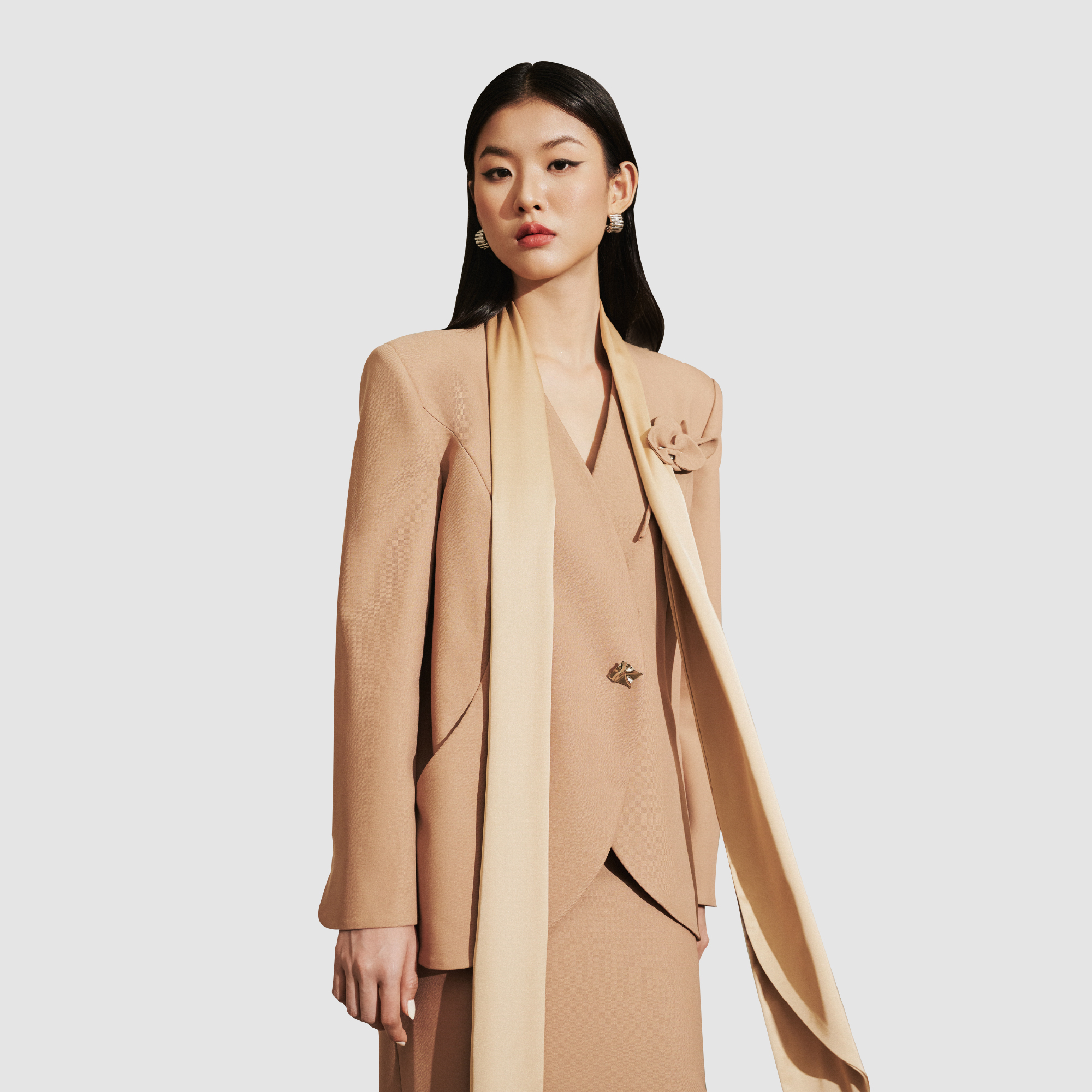 - Mô tả INFINITY / OLIVE Áo blazer không cổ, tay dài, vạt thân trước tròn, mở túi cong theo đường bổ, kèm dây lụa vạt chéo, có hoa đính ngực trái.