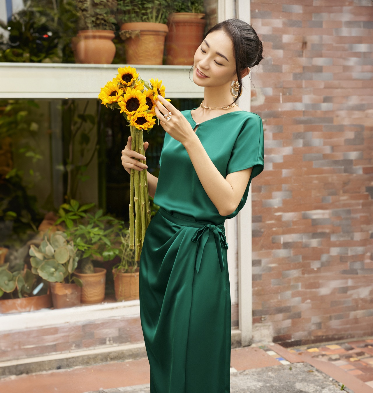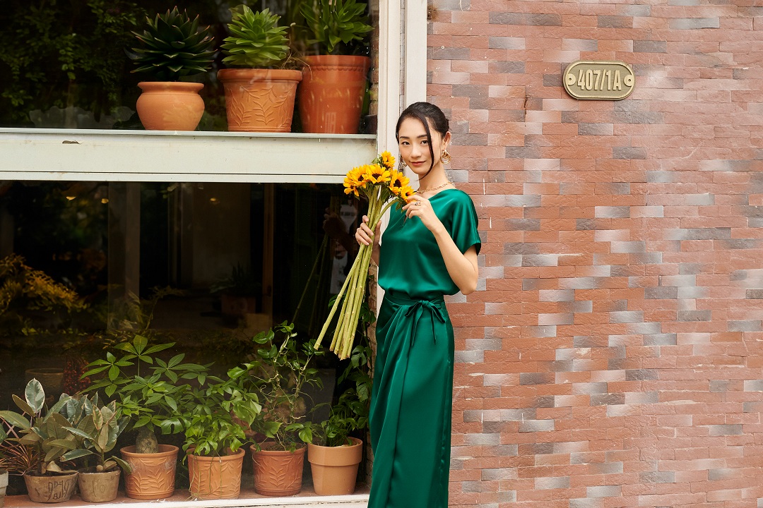 Gam màu xanh ngọc lục bảo mang lại vẻ giàu sang cho người mặc.Kiểu áo suông tay liền