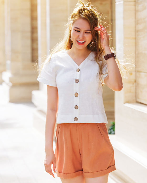 Áo Croptop Linen Calla TOP168 Thời trang thiết kế Hity Kiểu dáng áo croptop ngắn ngang lưng quần (vừa qua eo)Cổ V không veTay ngắn, lật bảng lai tayCài bằng nút gỗ phía trướcCHẤT LIỆULinen Cắt...