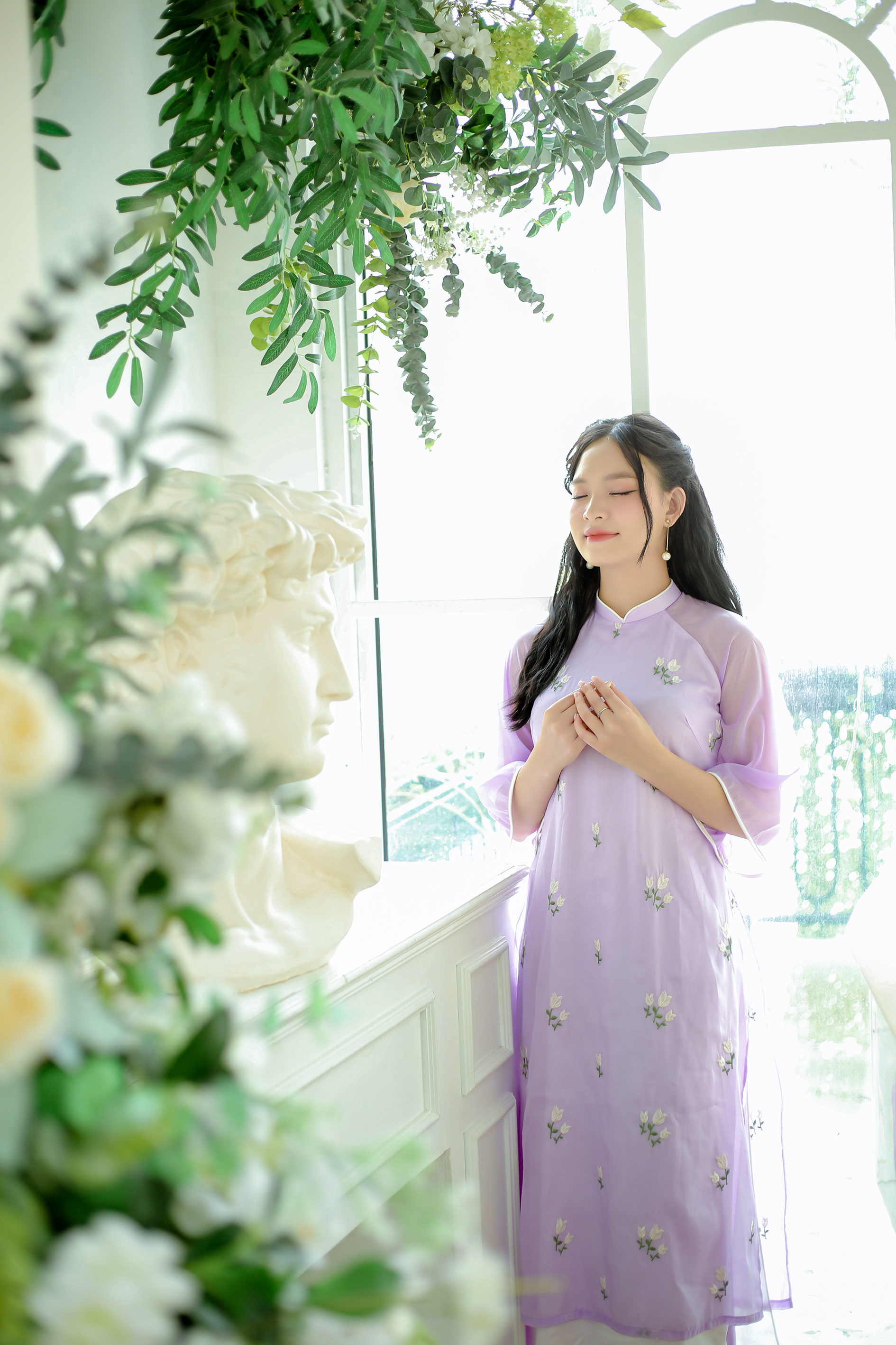 áo dài cách tân thiết kế form suông 4 tà màu tím hoa cà thêu hoa lá, lót lụa bên trong, tay lỡ loe viền trắng, quần lụa tím hoa cà