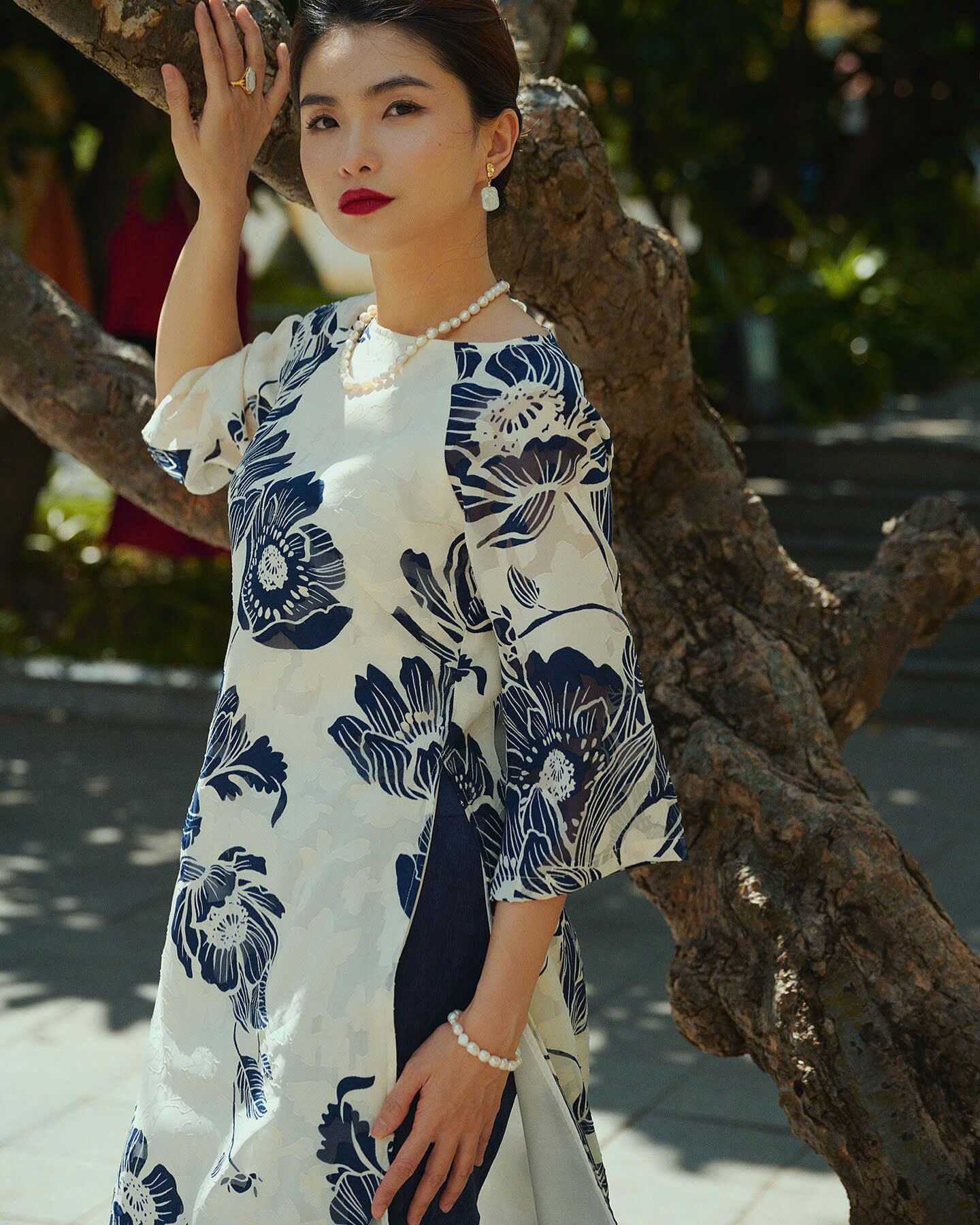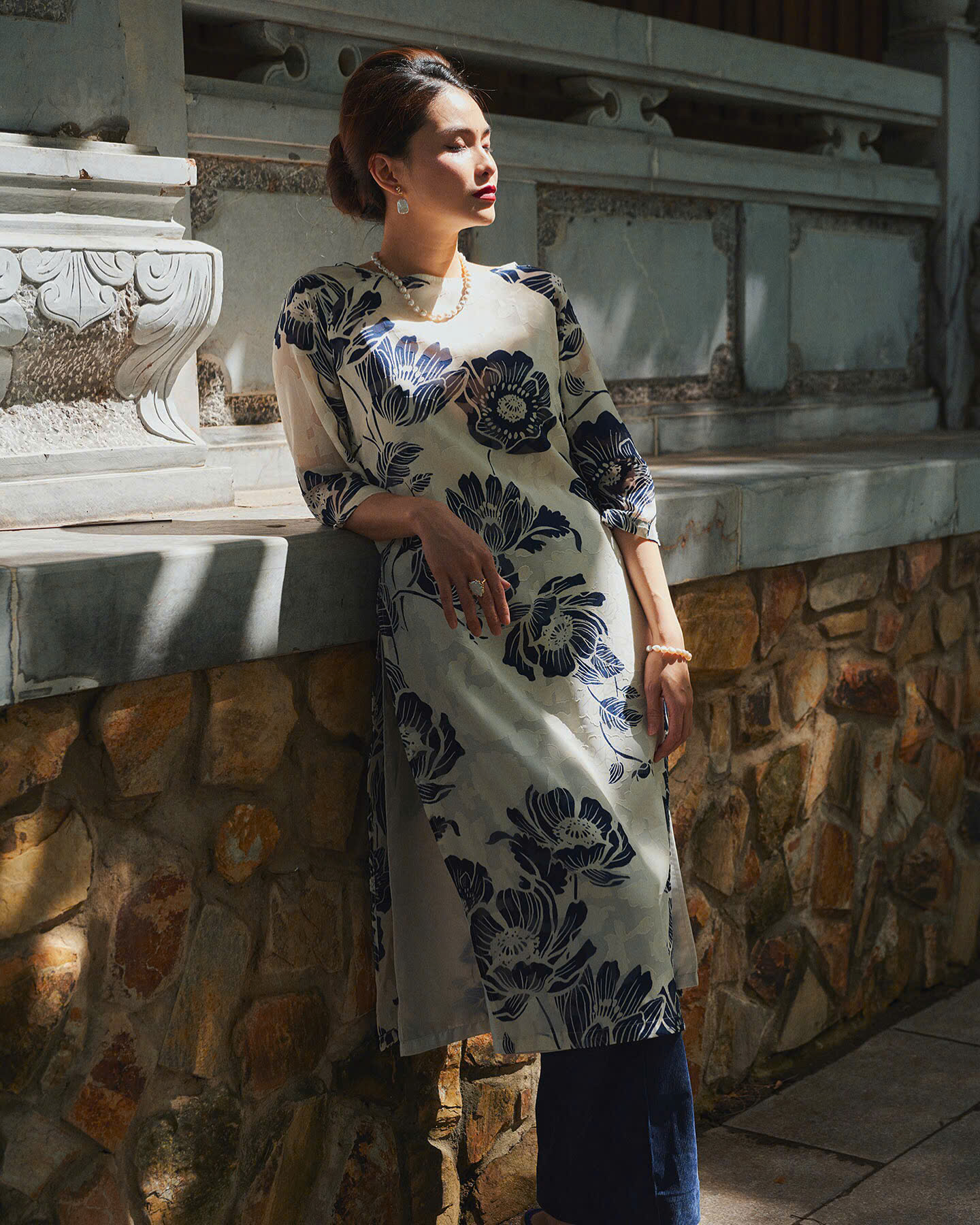 Áo được phối với quần âu tối màu, tạo sự hài hòa và cân đối. Phụ kiện như vòng cổ ngọc trai và bông tai đơn giản giúp hoàn thiện vẻ ngoài, vừa giữ được nét cổ điển vừa toát lên vẻ đương đại.