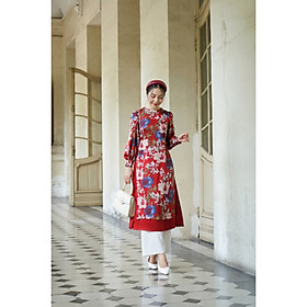 áo dài đỏ form suong may chất liệu lụa gấm kết hoa sen, tay lỡ loe, quần lụa trắng