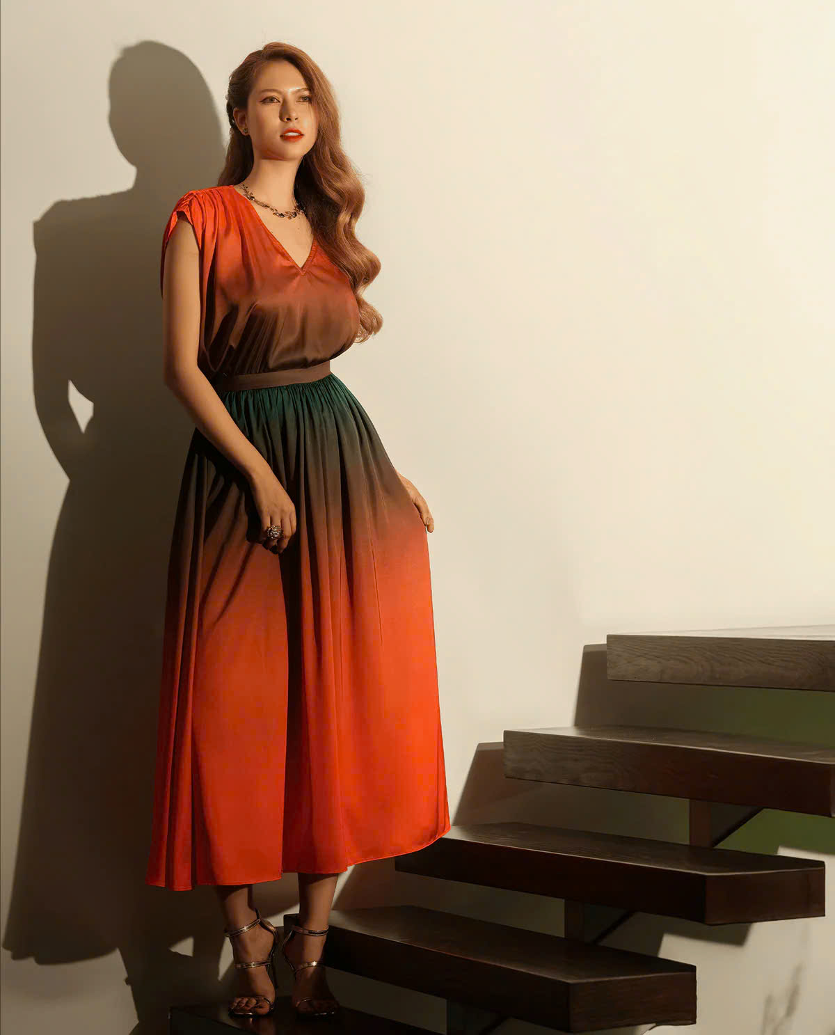 Chất liệu chính: Polyester, xuất xứ Trung Quốc Trong một buổi chiều khi ánh nắng dần lịm xuống nơi sườn đồi, tôi đã khoác lên không gian sắc màu của cảm xúc chiều tà. Bộ