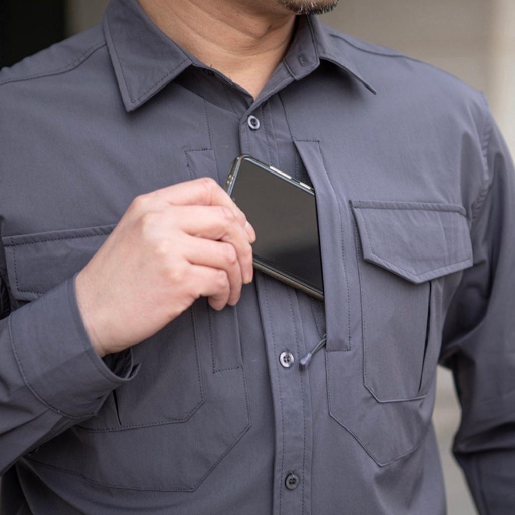 Áo sơ mi chiến thuật co giãn_nhanh khô được chế tạo đến 4 ngăn túi áo, được chia gồm 2 túi áo ngực và 1 túi bắp tay. Với túi áo ngực được thiết kế