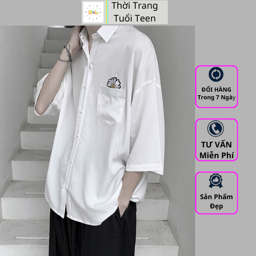 Áo sơ mi rộng có TÚI HOA CÚC trắng đen UNISEX tay ngắn - Áo sơ mi rộng dành cho nam và nữ, mặc rộng thoải mát - Áo sơ mi form rộng trắng đen