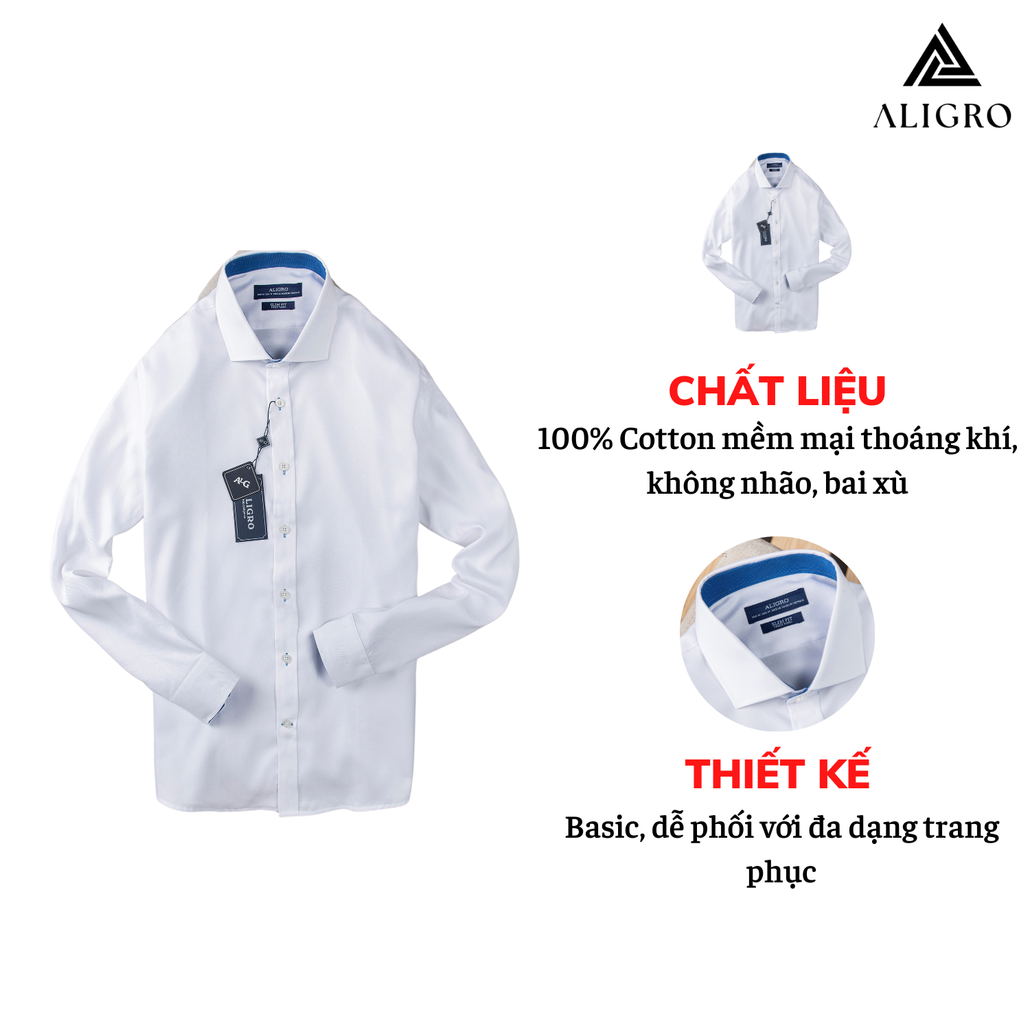 ✨Áo sơ mi nam dài tay ALIGRO cổ bẻ dáng ôm body 100% chất cotton trắng phối cổ ALGS194