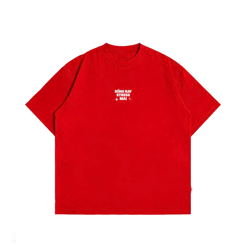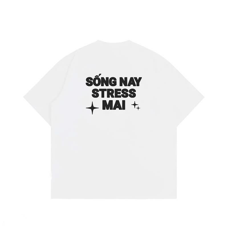 - Thiết kế in chữ "SỐNG NAY STRESS MAI" nổi bật trên nền áo tạo điểm nhấn độc đáo, giúp bạn thể hiện phong cách sống tự tin, vui tươi, và không quá lo nghĩ về những áp lực thường nhật.
