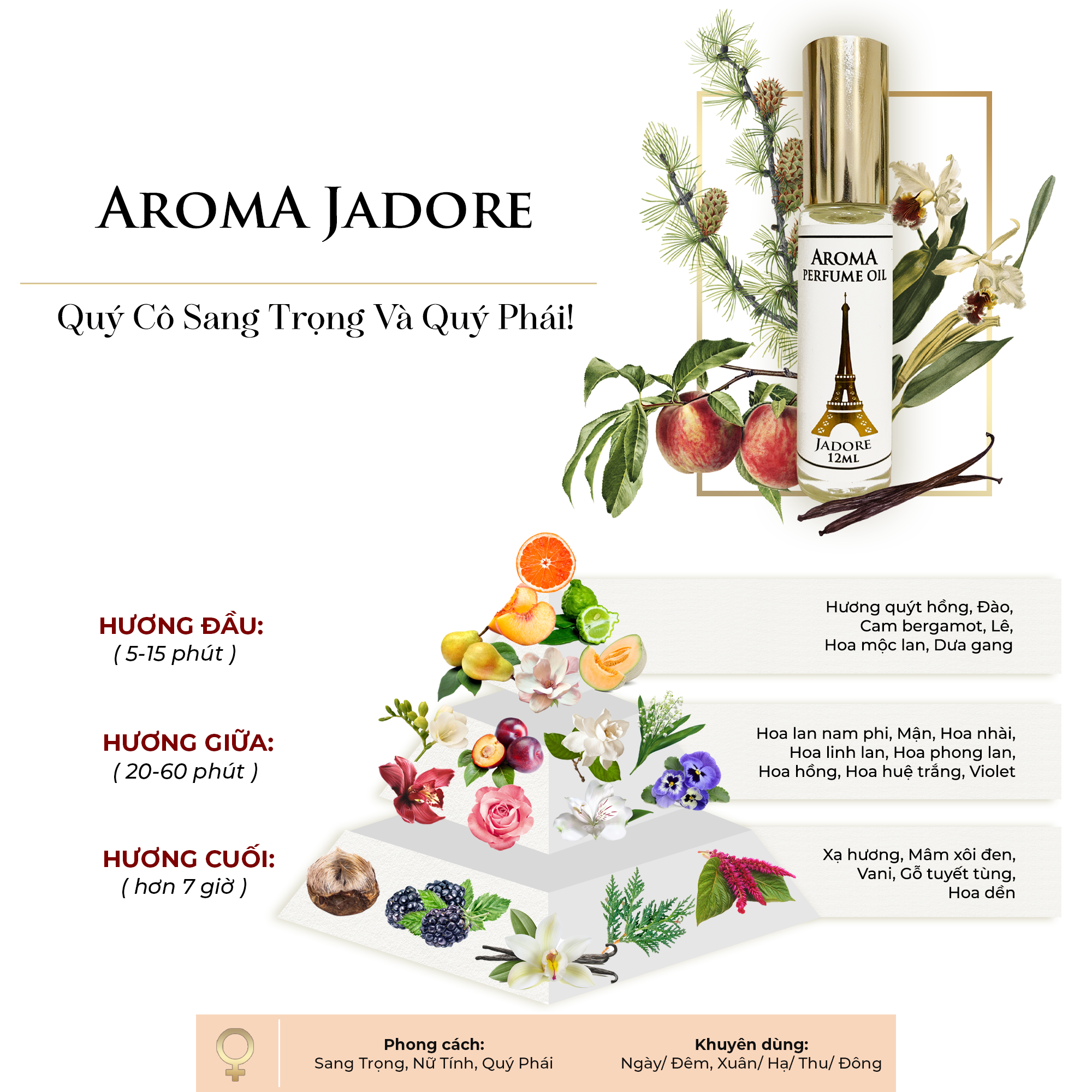 - Cảm nhận sự sang trọng và quý phái với mùi hương nước hoa nữ Aroma Jadore – một mùi hương hoa cỏ trái cây đầy tinh tế và nữ tính