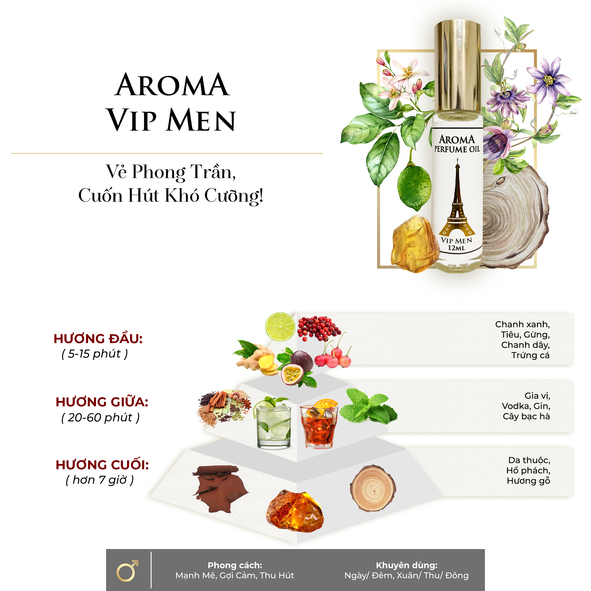 Tinh Dầu Nước Hoa Nam Aroma Vip Men - mùi hương tinh dầu nước hoa Pháp cho nam khiến những cô gái chết mê chết mệt. Aroma Vip Men mang sự nổi loạn nhưng vẫn