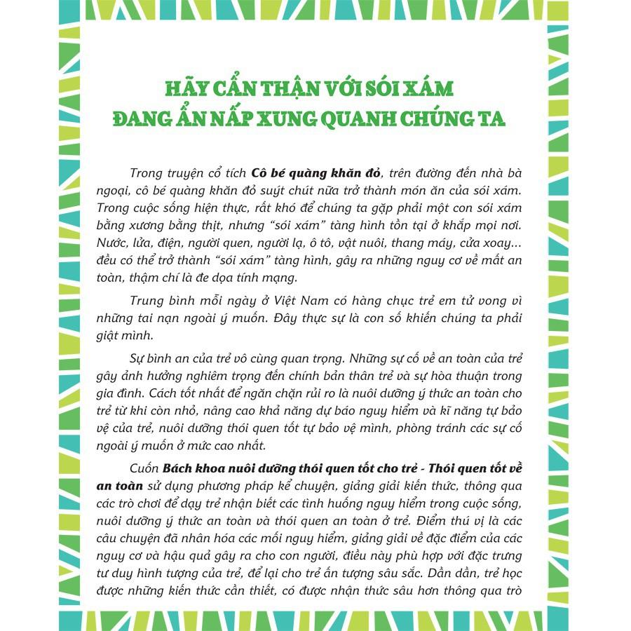 Cuốn Bách khoa nuôi dưỡng thói quen tốt cho trẻ - Thói quen tốt về an toàn sử dụng phương pháp kể chuyện, giảng giải kiến thức, thông qua các trò chơi để dạy trẻ nhận biết các tình huống nguy hiểm trong cuộc sống, nuôi dưỡng ý thức an toàn và thói quen an toàn ở trẻ. Điểm thú vị là các câu chuyện đã nhân hóa các mối nguy hiểm, giảng giải về đặc điểm của các nguy cơ và hậu quả gây ra cho con người, điều này phù hợp với đặc trưng tư duy hình tượng của trẻ, để lại cho trẻ ấn tượng sâu sắc. Dần dần, trẻ học được những kiến thức cần thiết, có được nhận thức sâu hơn thông qua trò chơi, từ đó nuôi dưỡng thói quen tốt. Đây thực sự là cuốn bách khoa giáo dục an toàn cho trẻ có nội dung mới mẻ, thực tế và hấp dẫn.