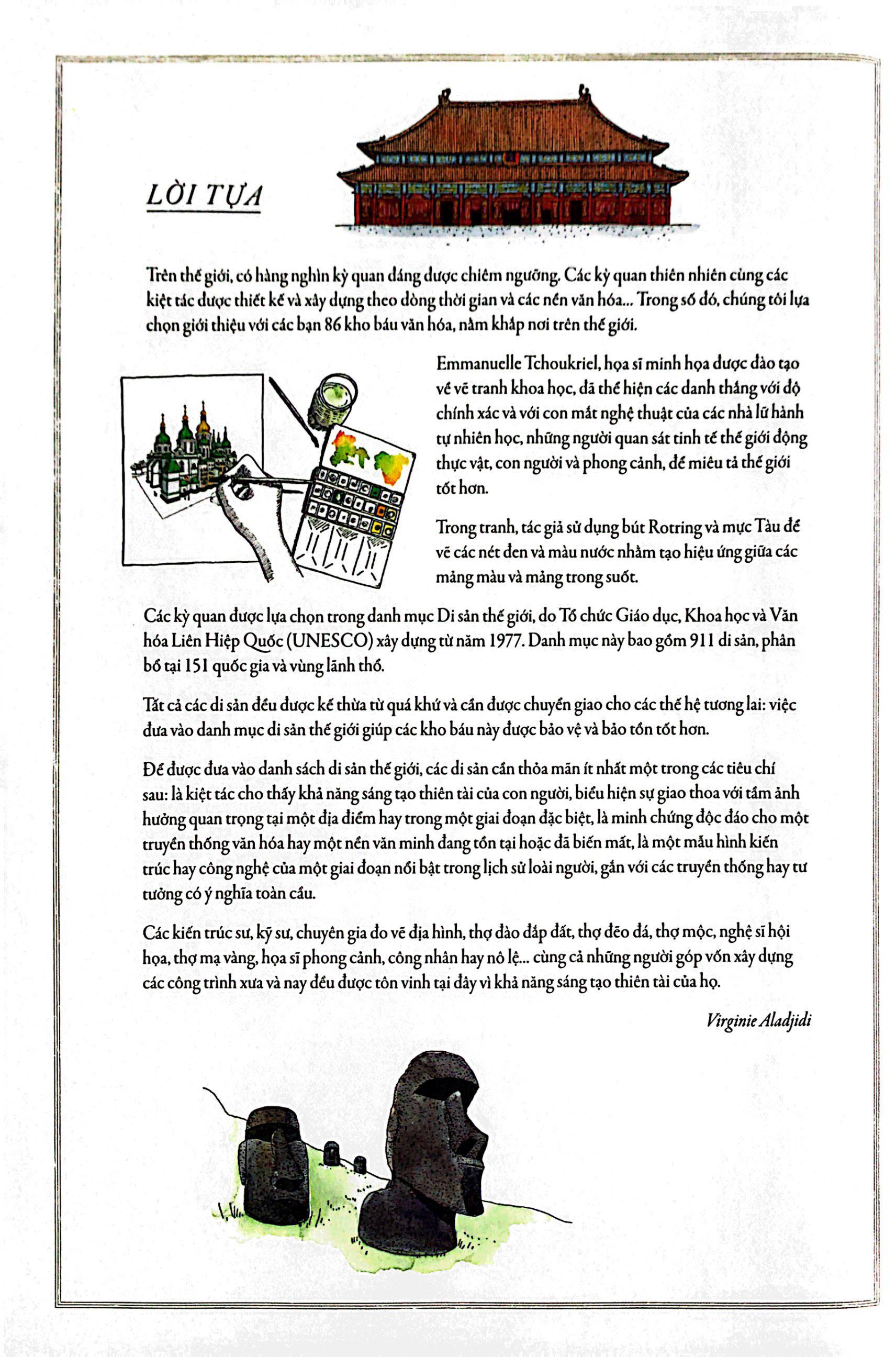 Nét vẽ của Emmanuelle Tchoukriel tái hiện chính xác và khéo léo sự đa dạng của kiến trúc và vẻ đẹp của di sản tại hơn 50 quốc gia! Bên cạnh đó, nội dung sách cung cấp tài liệu tham khảo về quá trình xây dựng và đặc trưng văn hóa của từng địa điểm.