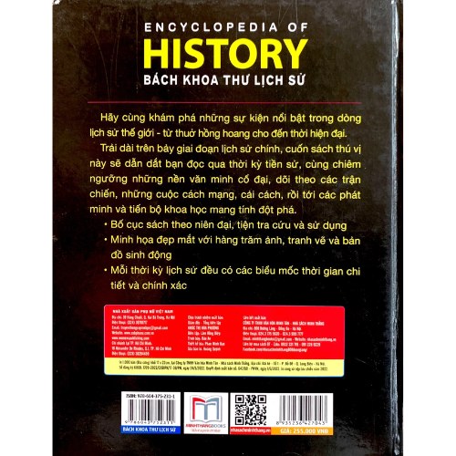 Bách Khoa Thư Lịch Sử - Từ Tiền Sử Đến Thời Đại (Bìa Cứng) - Tái Bản Giới thiệu sách Hãy cùng khám phá những sự kiện nổi bật trong dòng lịch sử thế giới – từ thuở hồng hoang cho đến thời hiện đại. Trải dài trên bảy giai đoạn lịch sử chính, cùng chiêm ngưỡng những nền văn minh cổ đại, dõi theo các trận chiến, những cuộc cách mạng cải cách, rồi tới các phát minh và tiến bộ khoa học mang tính đột phá. Đối tượng sử dụng Mọi người yêu thích lịch sử Học sinh, sinh viên Tóm tắt nội dung