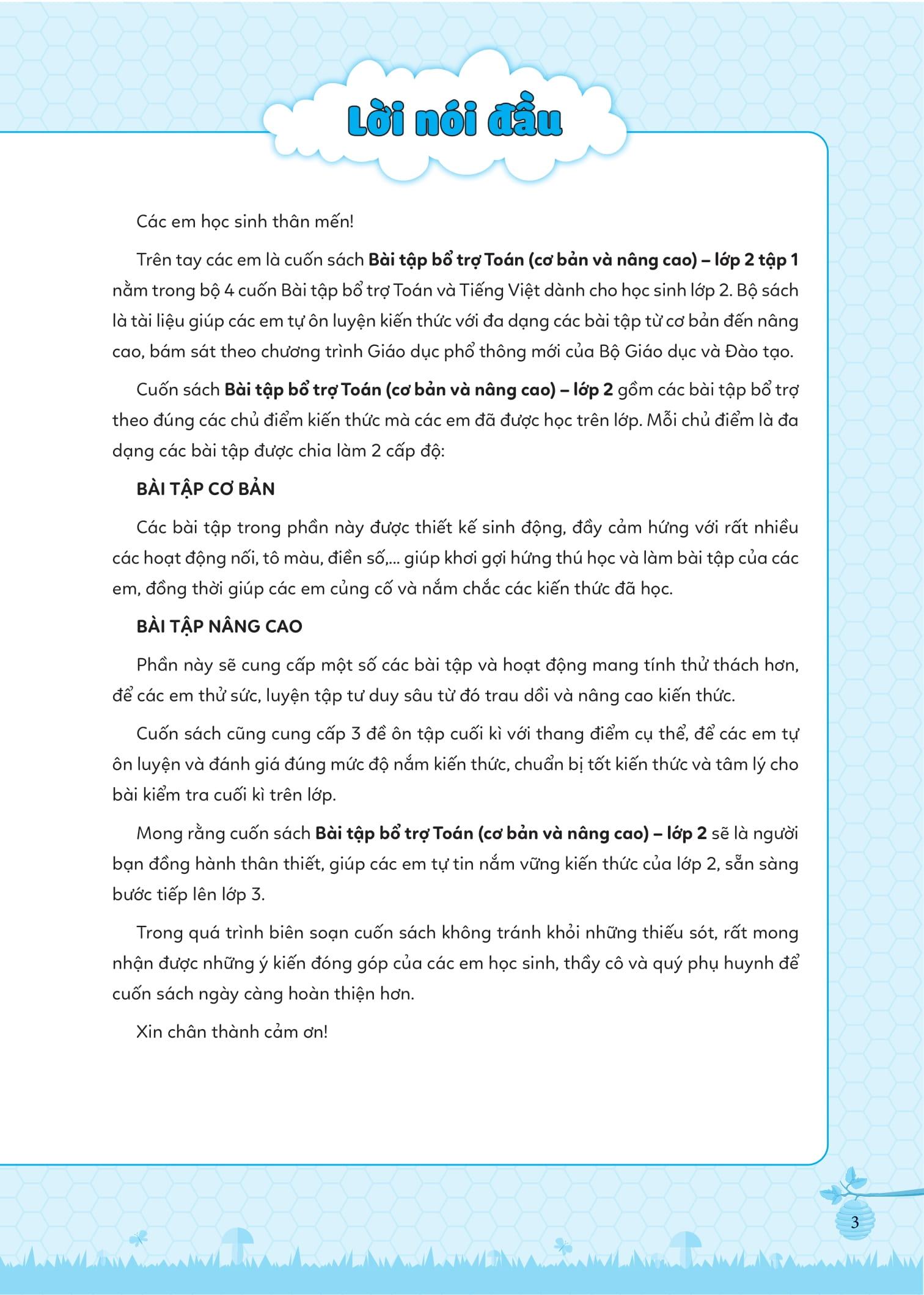 - Đáp án chi tiết, rõ ràng Phần đáp án chi tiết ở cuối sách giúp phụ huynh và các con có thể tự đối chiếu và đánh giá sau khi hoàn thành bài tập, từ đó có phương pháp ôn luyện phù hợp cho con. Mong rằng cuốn sách Bài tập bổ trợ Toán – lớp 2 (cơ bản và nâng cao) Tập 1 sẽ là người bạn đồng hành thân thiết, giúp các em tự tin nắm vững kiến thức của lớp 2, sẵn sàng bước tiếp lên lớp 3.