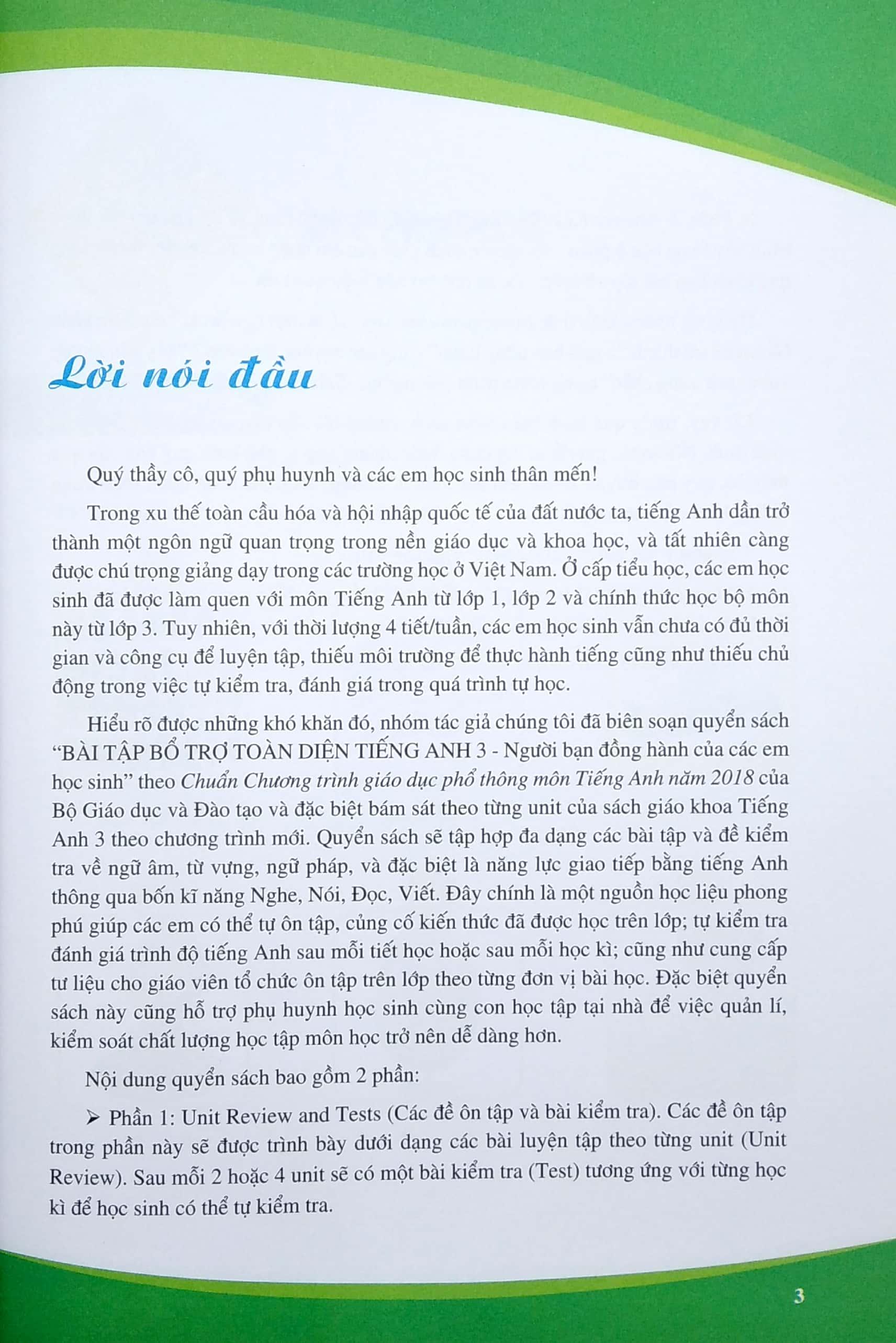 Theo Chuẩn Chương trình giáo dục phổ thông môn Tiếng Anh năm 2018 của Bộ Giáo dục và Đào tạo và đặc biệt bám sát theo từng unit của sách giáo khoa Tiếng Anh 3 theo chương trình mới. Quyển sách sẽ tập hợp đa dạng các bài tập và đề kiểm tra về ngữ âm, từ vựng, ngữ pháp, và đặc biệt là năng lực giao tiếp bằng tiếng Anh thông qua bốn kĩ năng Nghe, Nói, Đọc, Viết. Đây chính là một nguồn học liệu phong phú giúp các em có thể tự ôn tập, củng cố kiến thức đã được học trên lớp.