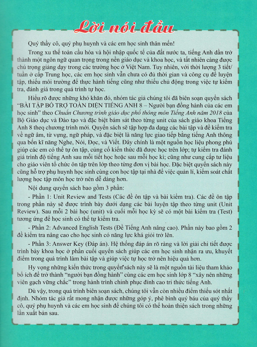 “BÀI TẬP BỔ TRỢ TOÀN DIỆN TIẾNG ANH 8 - Người bạn đồng hành của các em học sinh” theo Chuẩn Chương trình giáo dục phổ thông môn Tiếng Anh năm 2018 của Bộ Giáo dục và Đào tạo và đặc biệt bám sát theo từng unit của sách giáo khoa Tiếng Anh 8 theo chương trình mới. Quyển sách sẽ tập hợp đa dạng các bài tập và đề kiểm tra về ngữ âm, từ vựng, ngữ pháp, và đặc biệt là năng lực giao tiếp bằng tiếng Anh.