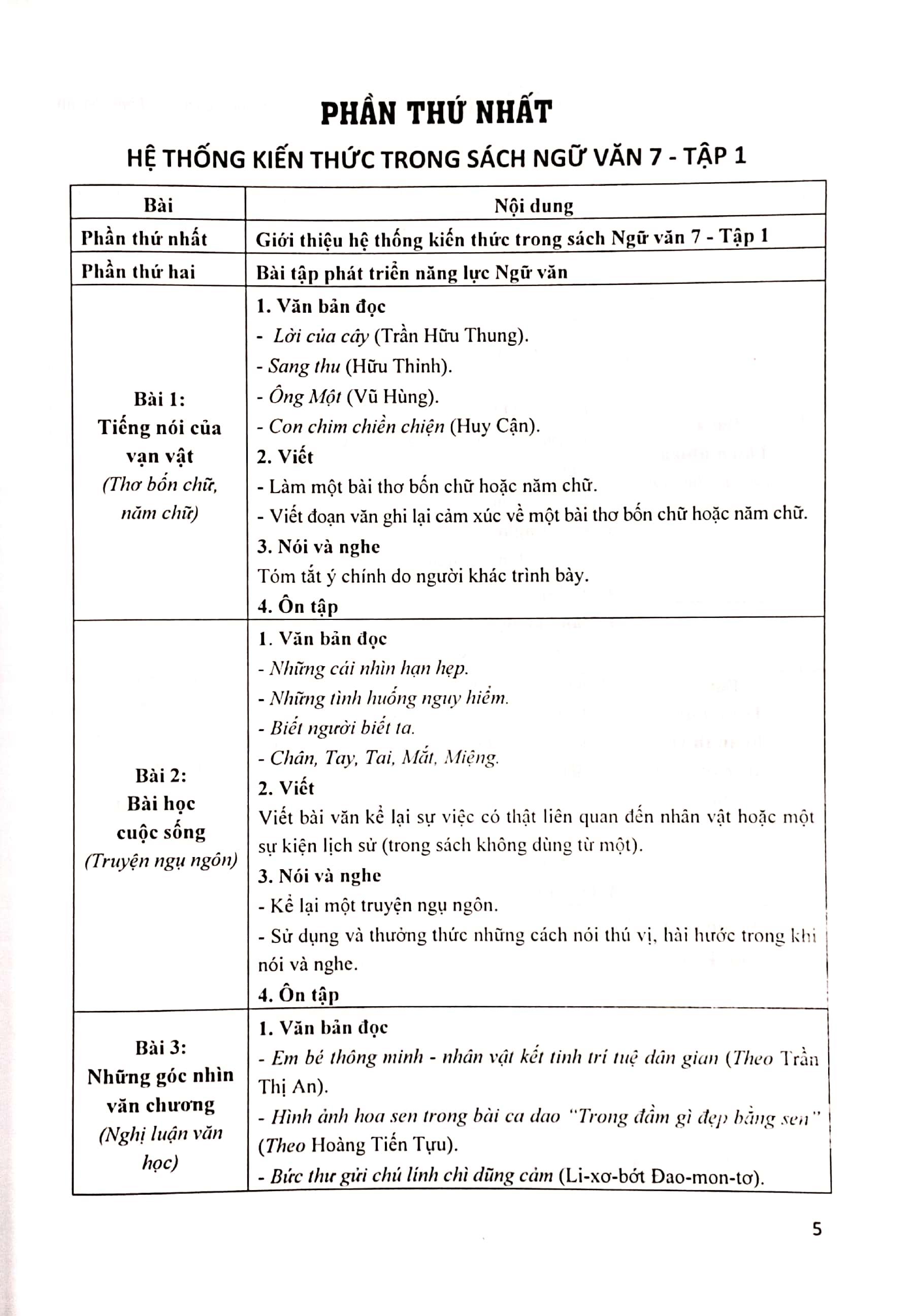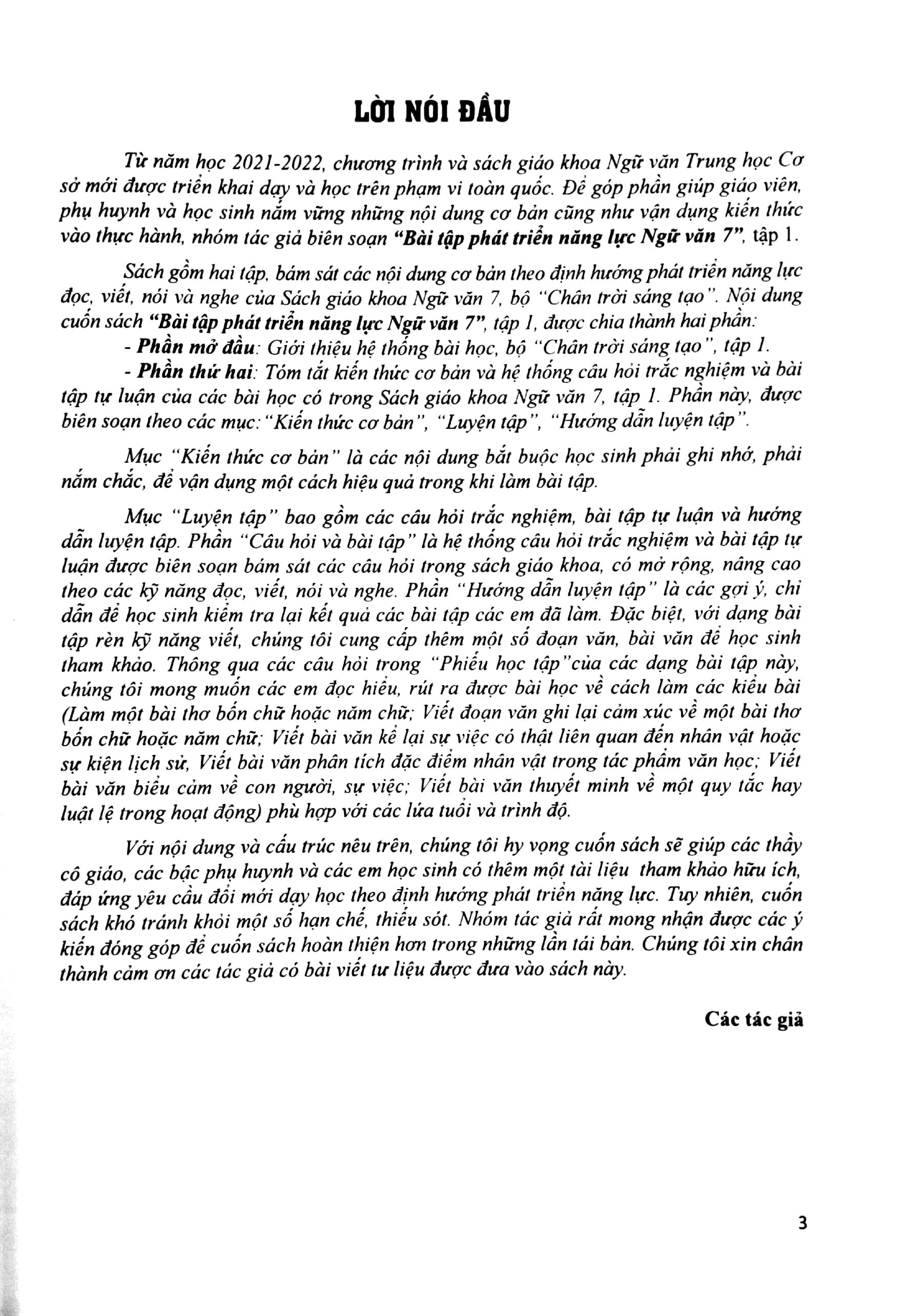 - Phần thứ hai: Tóm tắt kiến thức cơ bản và hệ thống câu hỏi trắc nghiệm và bài tập tự luận của các bài học có trong Sách giáo khoa Ngữ văn 7, tập 1. Phần này, được biên soạn theo các mục: “Kiến thức cơ bản”, “Luyện tập”, “Hướng dẫn luyện tập”. Mục “Kiến thức cơ bản” là các nội dung bắt buộc học sinh phải ghi nhớ, phải nắm chắc, để vận dụng một cách hiệu quả trong khi làm bài tập. I. Mục “Luyện tập” bao gồm các câu hỏi trắc nghiệm, bài tập tự luận và hướng dẫn luyện tập. Phần “Câu hỏi và bài tập” là hệ thống câu hỏi trắc nghiệm và bài tập tự luận được biên soạn bám sát các câu hỏi trong sách giáo khoa, có mở rộng, nâng cao theo các kỹ năng đọc, viết, nói và nghe. Phần “Hướng dẫn luyện tập” là các gợi ý, chỉ dẫn để học sinh kiểm tra lại kết quả các bài tập các em đã làm. Đặc biệt, với dạng bài tập rèn kỹ năng viết, chúng tôi cung cấp thêm một số đoạn văn, bài văn để học sinh tham khảo. Thông qua các câu hỏi trong “Phiếu học tập”của các dạng bài tập này, chúng tôi mong muốn các em đọc hiểu, rút ra được bài học về cách làm các kiểu bài (Làm một bài thơ bốn chữ hoặc năm chữ; Viết đoạn văn ghi lại cảm xúc về một bài thơ bốn chữ hoặc năm chữ Viết bài văn kể lại sự việc có thật liên quan đến nhân vật hoặc sự kiện lịch sử, Viết bài văn phân tích đặc điểm nhân vật trong tác phẩm văn học; Viết bài văn biểu cảm về con người, sự việc; Viết bài văn thuyết minh về một quy tắc hay luật lệ trong hoạt động phù hợp với các lứa tuổi và trình độ. Với nội dung và cấu trúc nêu trên, chúng tôi hy vọng cuốn sách sẽ giúp các thầy cô giáo, các bậc phụ huynh và các em học sinh có thêm một tài liệu tham khảo hữu ích, đáp ứng yêu cầu đổi mới dạy học theo định hướng phát triển năng lực. Tuy nhiên, cuốn sách khó tránh khỏi một số hạn chế, thiếu sót. Nhóm tác giả rất mong nhận được các ý kiến đóng góp để cuốn sách hoàn thiện hơn trong những lần tái bản. Chúng tôi xin chân thành cảm ơn các tác giả có bài viết tư liệu được đưa vào sách này.