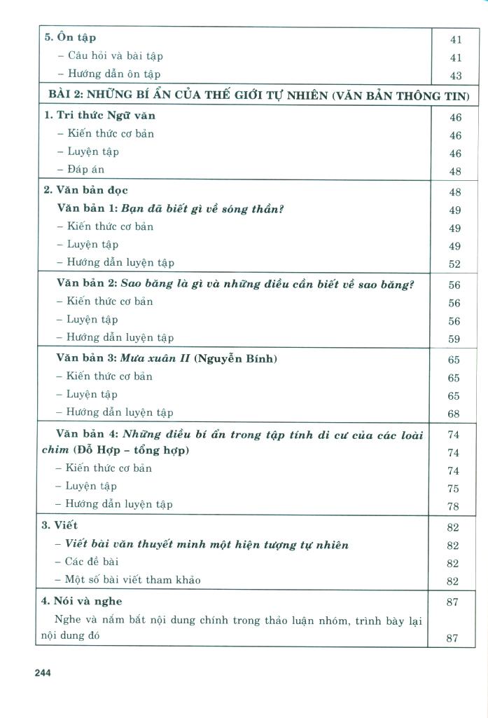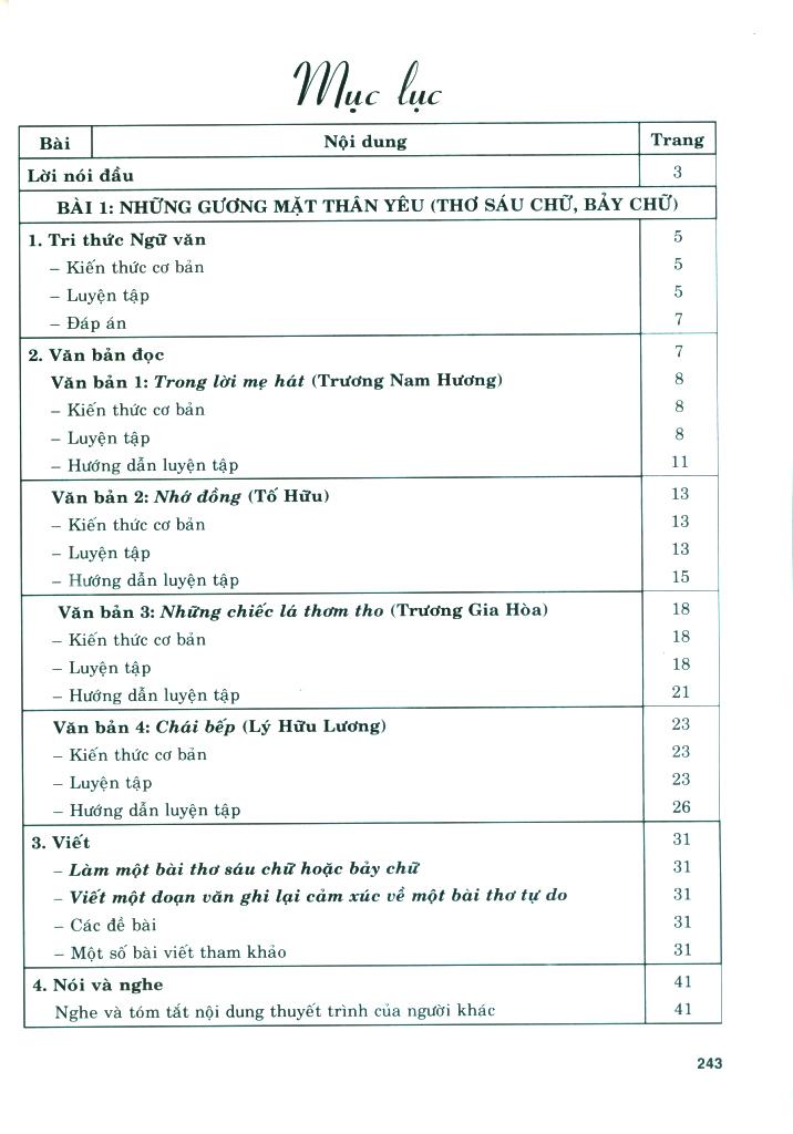 - Phần "Luyện tập" bao gồm các câu hỏi trắc nghiệm khách quan, bài tập tự luận và hướng dẫn luyện tập. Mục "Câu hỏi và bài tập" là hệ thống câu hỏi trắc nghiệm khách quan và bài tập tự luận được biên soạn bám sát các câu hỏi trong sách giáo khoa, có mở rộng, nâng cao theo các kỹ năng đọc, viết, nói và nghe. Mục "Hướng dẫn luyện tập" là các gợi ý, chỉ dẫn để học sinh kiểm tra lại kết quả các bài tập các em đã làm. Đặc biệt, với dạng bài tập rèn kỹ năng viết, chúng tôi cung cấp thêm một số đoạn văn, bài văn để học sinh tham khảo. Thông qua các câu hỏi trong "Phiếu học tập", chúng tôi muốn các em đọc hiểu, rút ra được bài học về cách làm các kiểu bài (Làm một bài thơ sáu chữ hoặc bảy chữ; Viết một đoạn văn ghi lại cảm nghĩ về một bài thơ tự do; Viết bài văn thuyết minh, giải thích một hiện tượng tự nhiên; Viết bài văn nghị luận về một vấn đề của đời sống: Viết bài văn kể lại một chuyến đi hay một hoạt động xã hội; Viết văn bản kiến nghị về một vấn đề của đời sống). Với nội dung và cấu trúc nêu trên, chúng tôi hy vọng cuốn sách sẽ giúp các thầy cô giáo, các bậc phụ huynh và các em học sinh có thêm một tài liệu học tập và tham khảo hữu ích, đáp ứng yêu cầu đổi mới dạy học theo định hướng phát triển năng lực.
